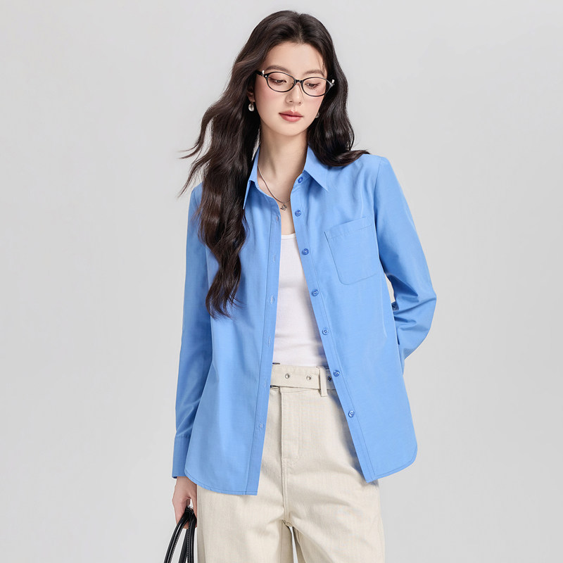 纯白浅蓝尖领通勤宽松法式衬衫女