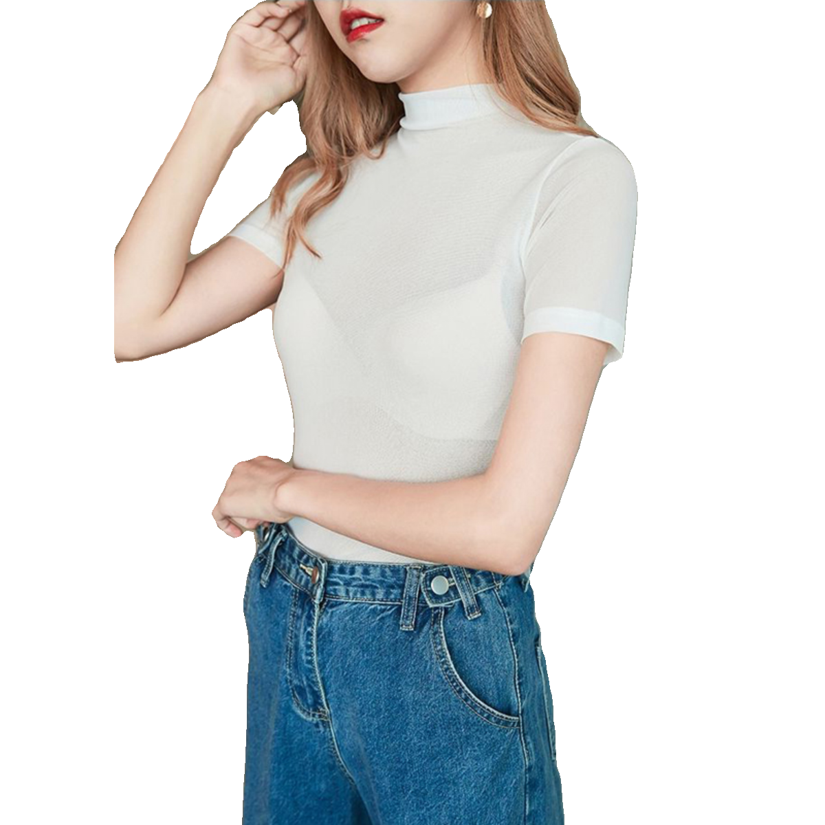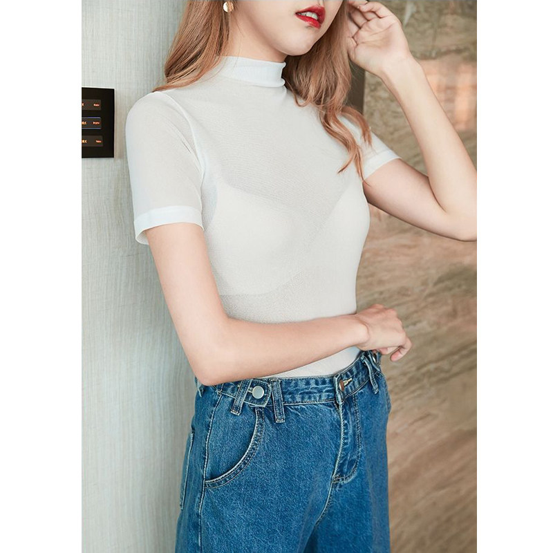薄款高领黑色透明网纱打底衫女短袖紧身显瘦性感内搭蕾丝t恤上衣