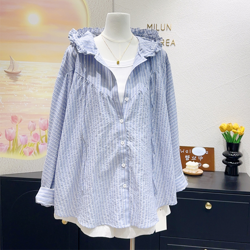 韩国订单款~100%棉海盐蓝色竖条纹花边连帽中长款衬衫防晒衫遮肉