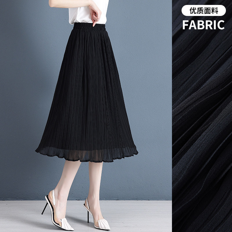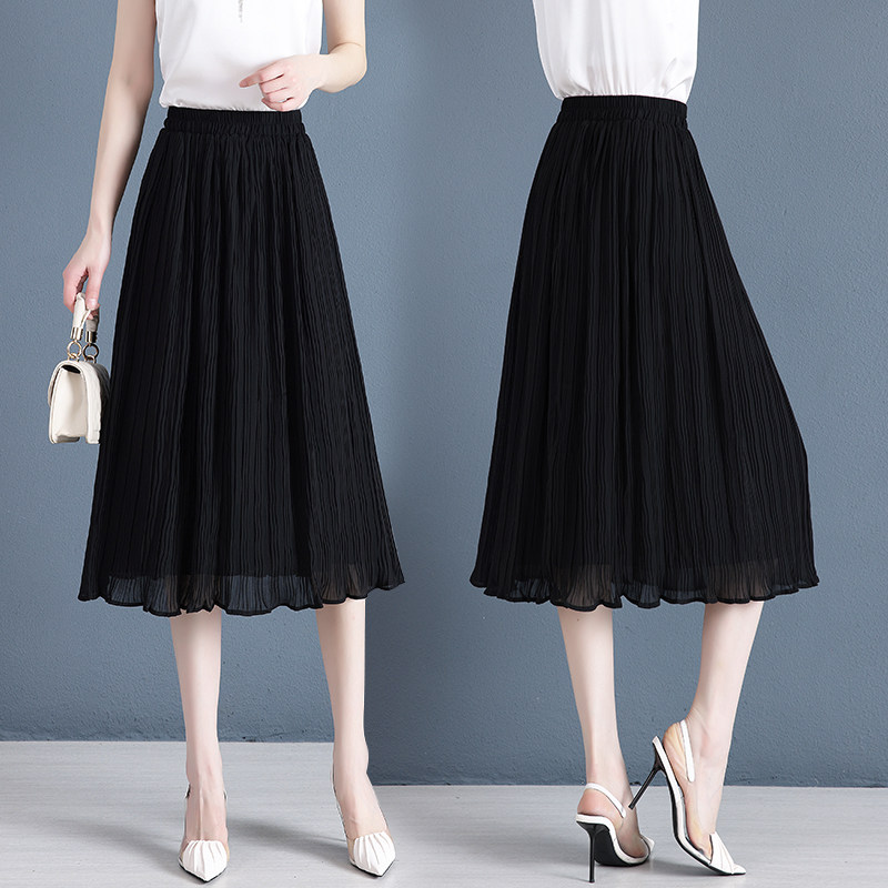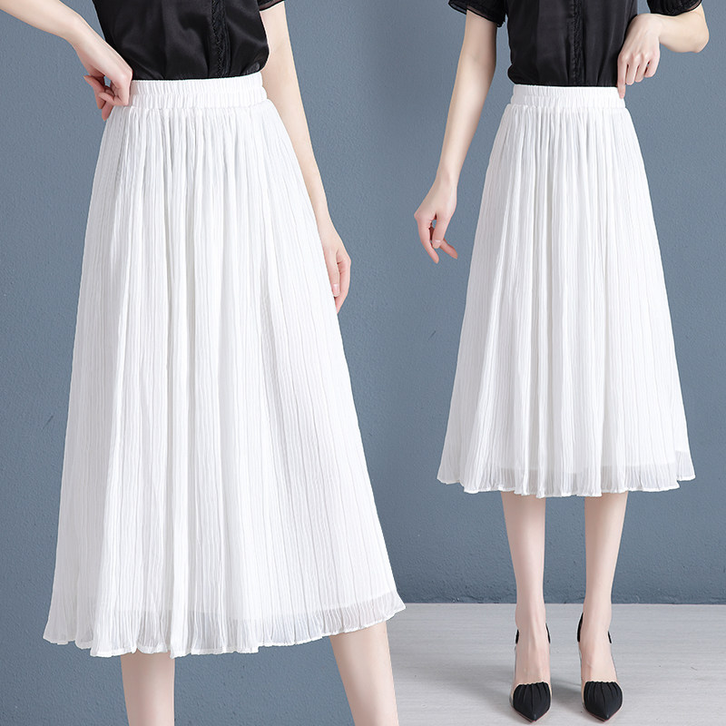白色雪纺半身裙女春夏季中长款薄款松紧高腰显瘦垂感a字百褶裙子
