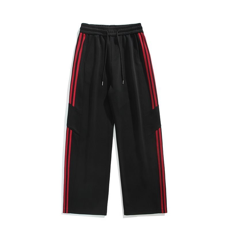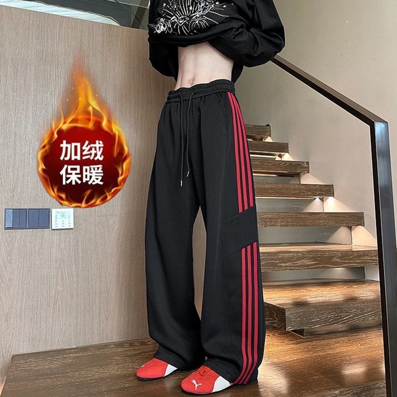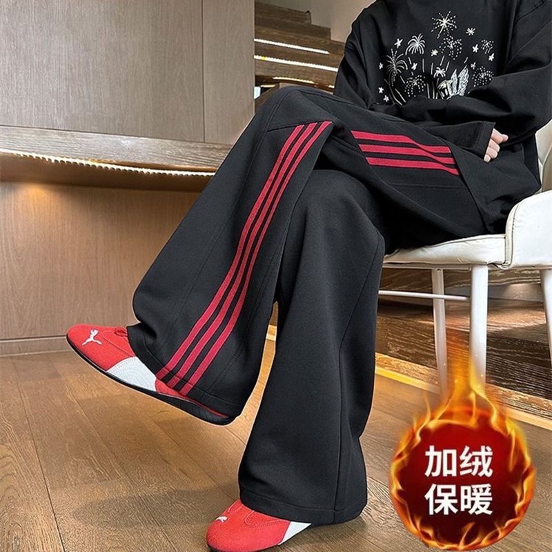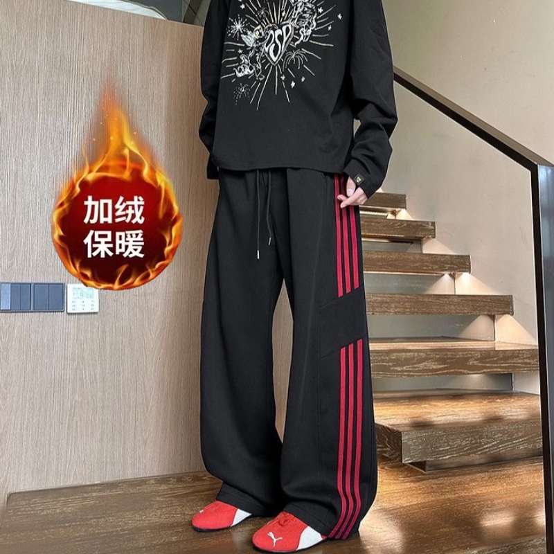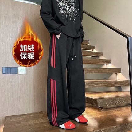 潮牌美式三条杠运动裤男秋冬季休闲裤宽松阔腿加绒加厚直筒长裤子