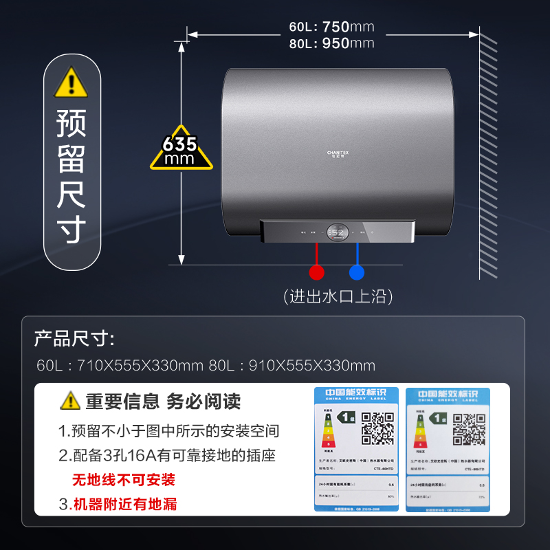 AO史密斯佳尼特电热水器家用金圭扁桶双胆速热一级能效6080升HTD