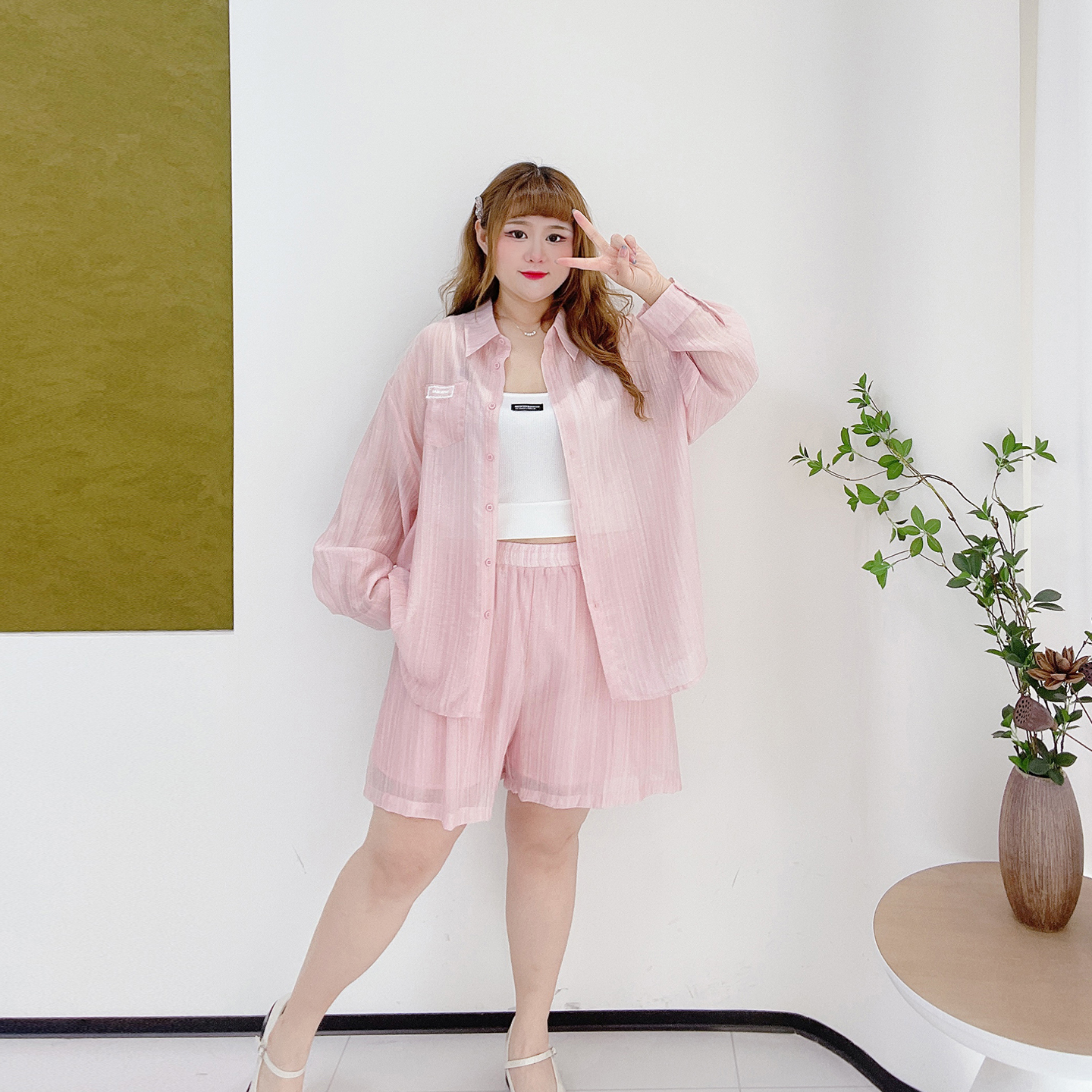 韩系减龄多巴胺遮肉胖莹莹大码女装夏季轻薄休闲衬衫阔腿短裤套装