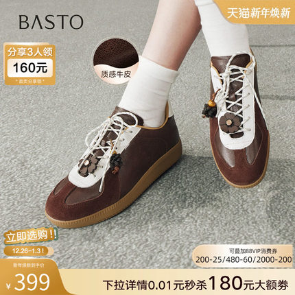 百思图2026春商场新款真皮厚底德训鞋板鞋休闲运动鞋女鞋UZU01AM6