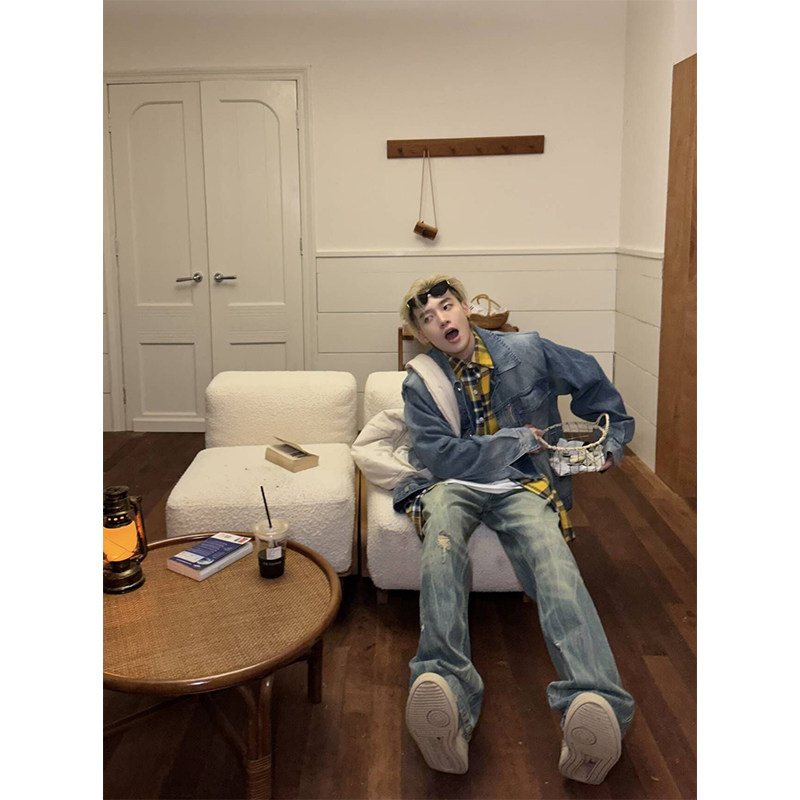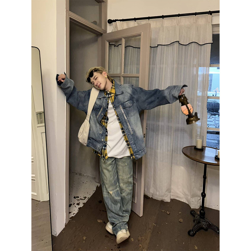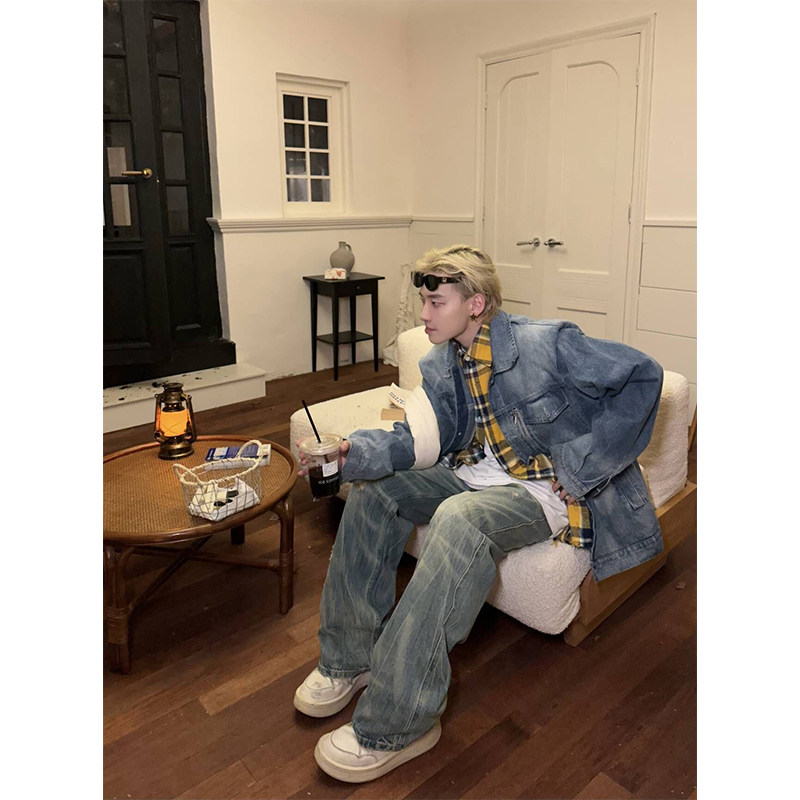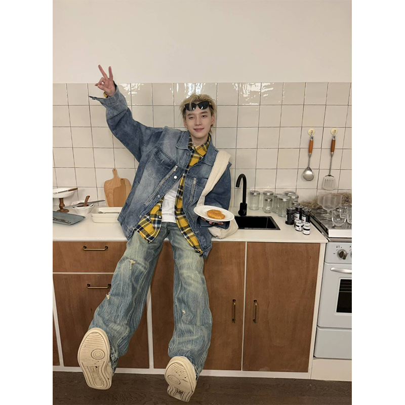 NECOYEP 2025美式复古水洗做旧直筒牛仔裤男痞帅宽松阔腿长裤子
