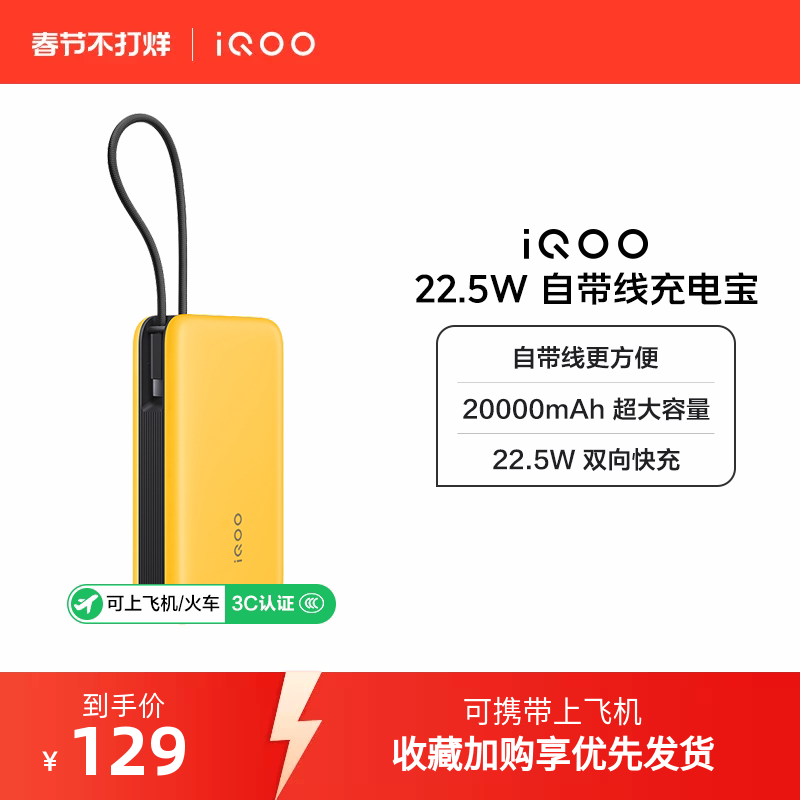 【3C认证】iQOO自带线充电宝20000毫安22.5W可上飞机大容量快充移动电源便携正品