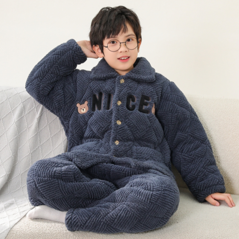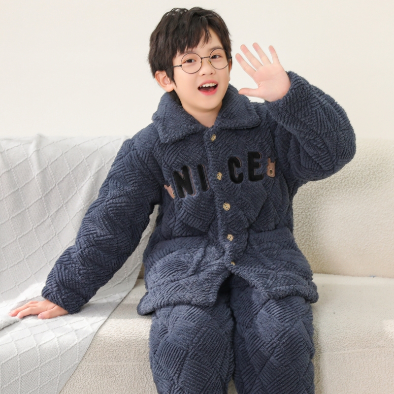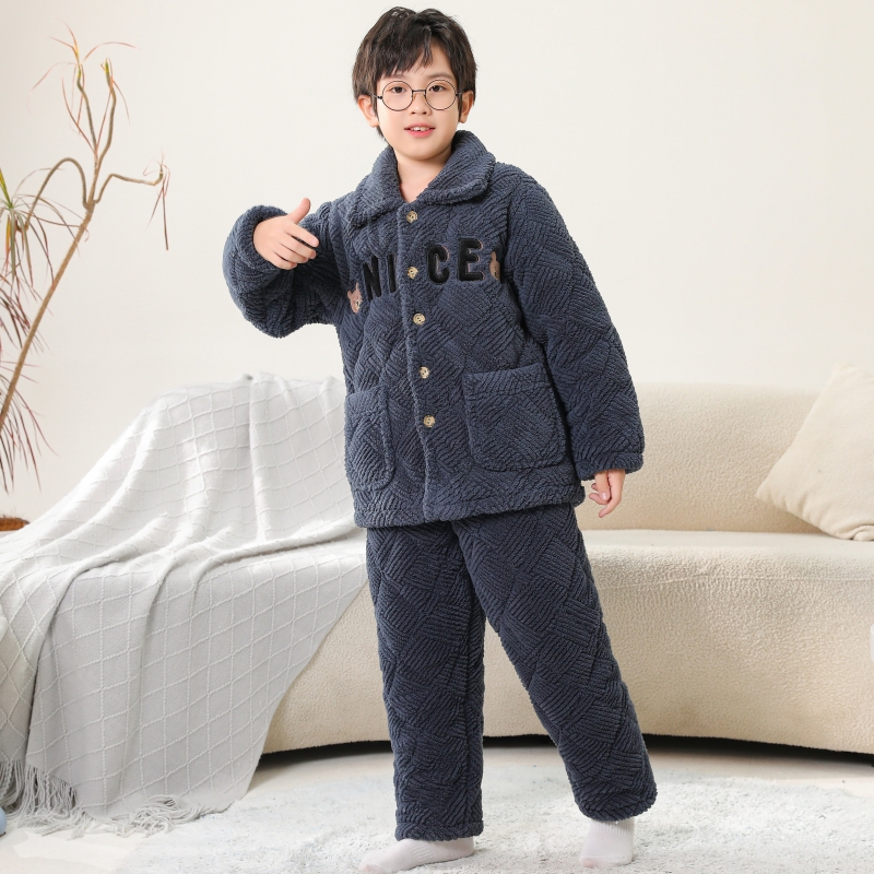 儿童睡衣冬季加厚款男童珊瑚绒中大童加绒保暖法兰绒三层夹棉男孩