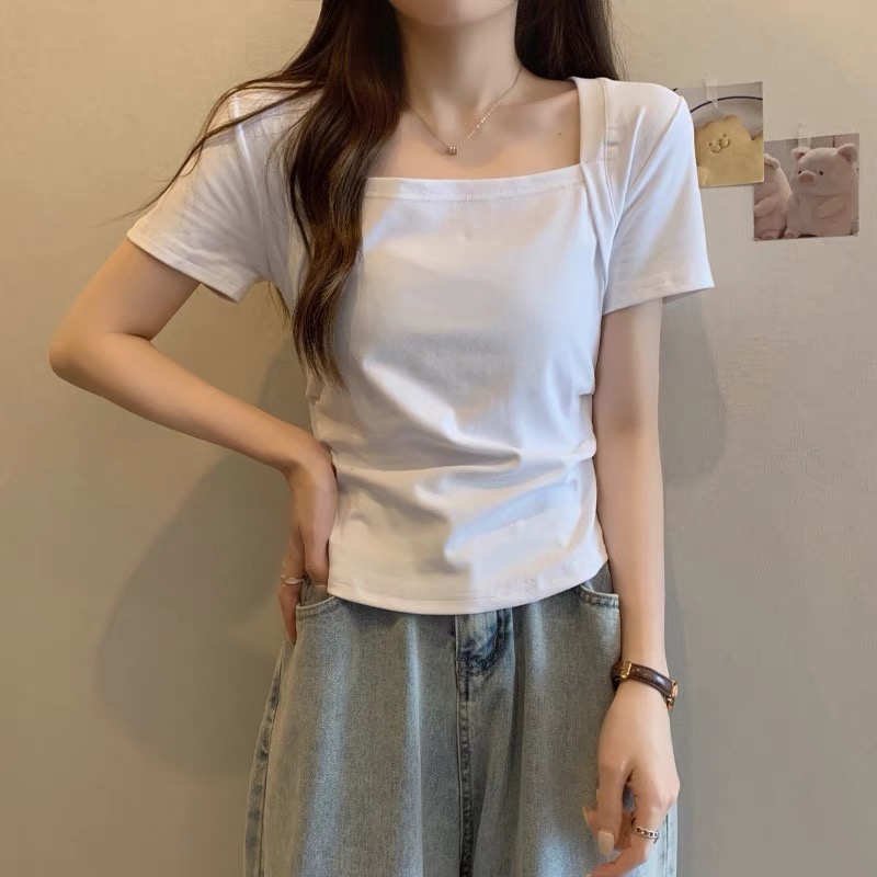 2024春夏方领正肩短袖T恤女大码胖mm别致气质小衫显瘦休闲裤套装