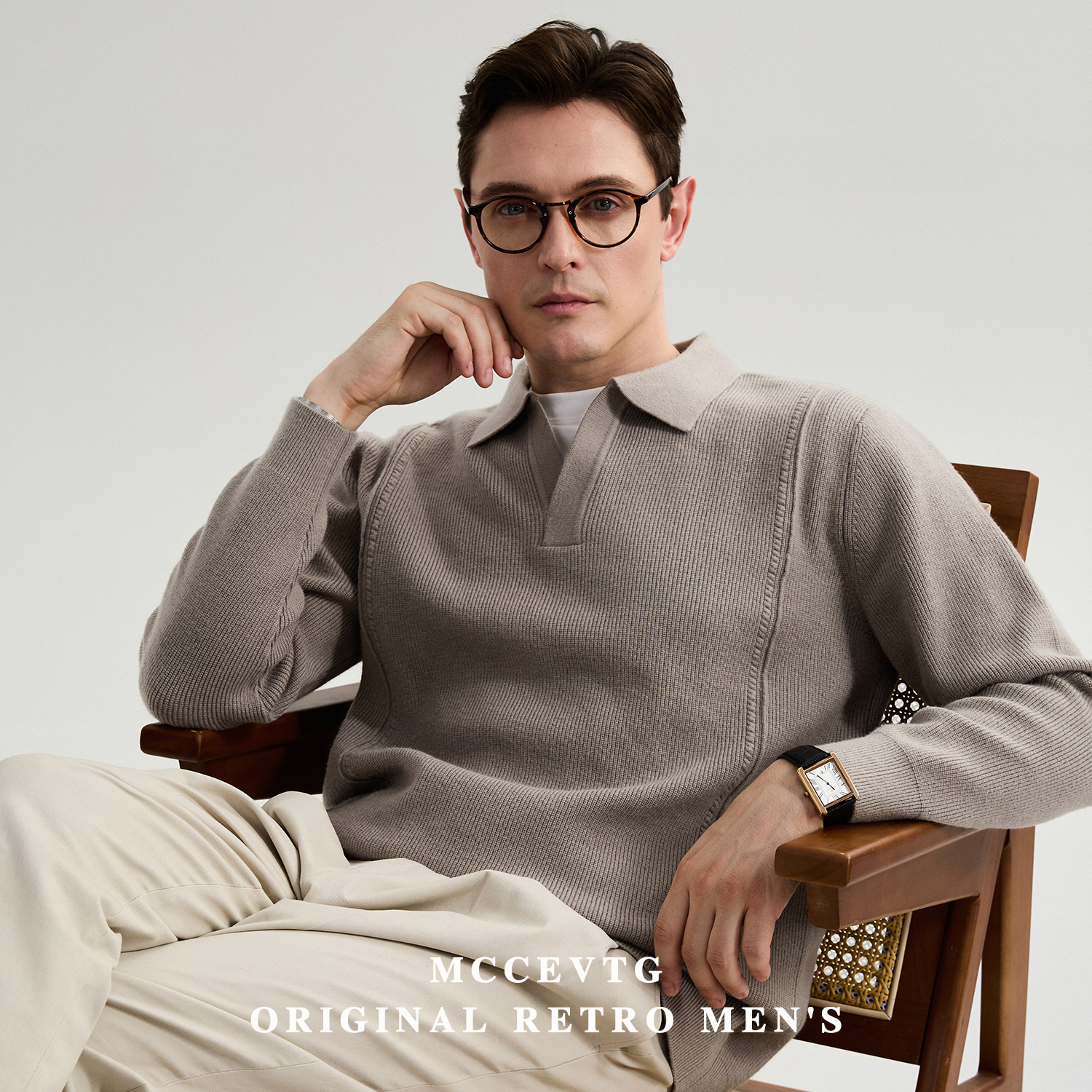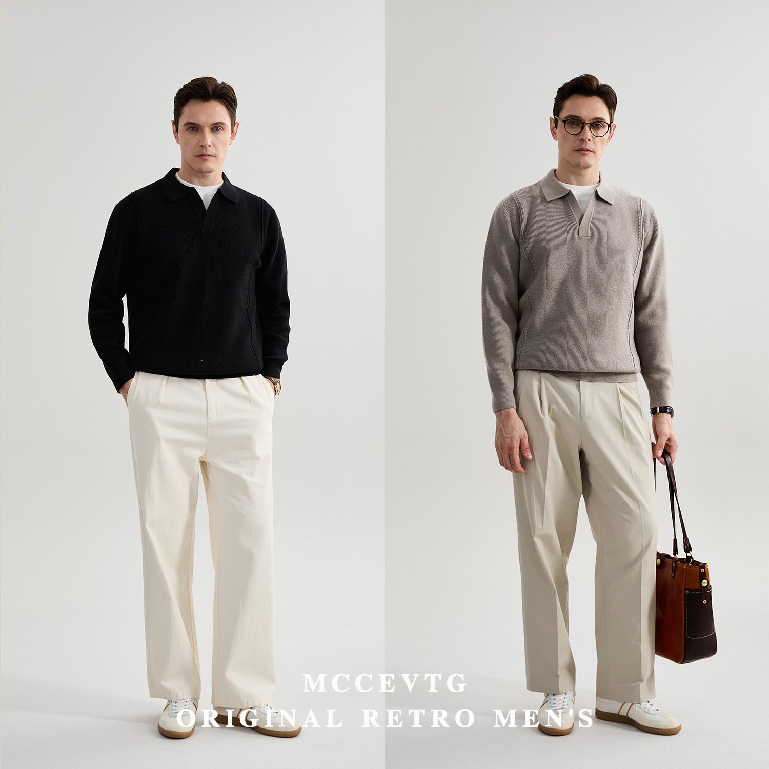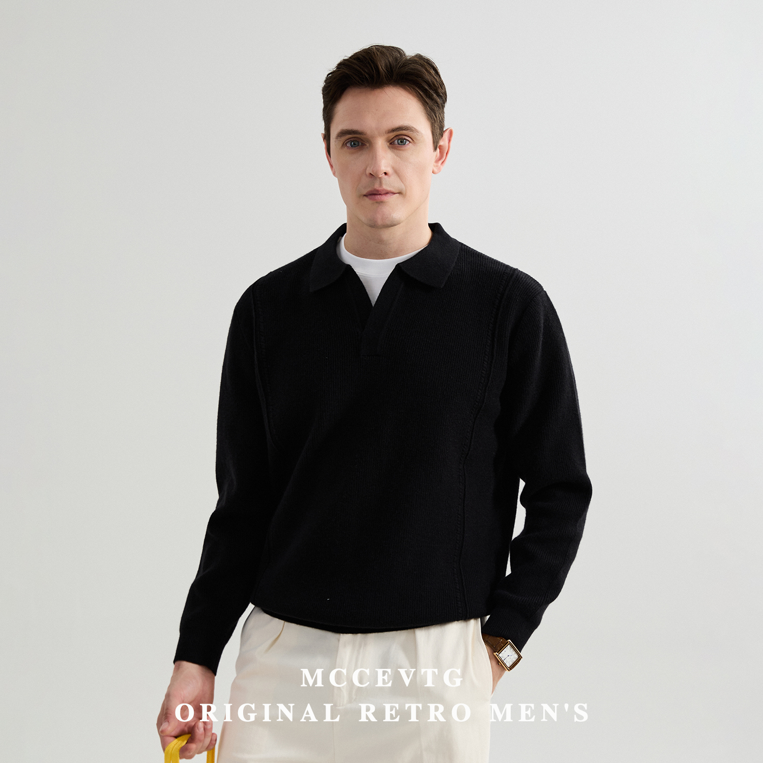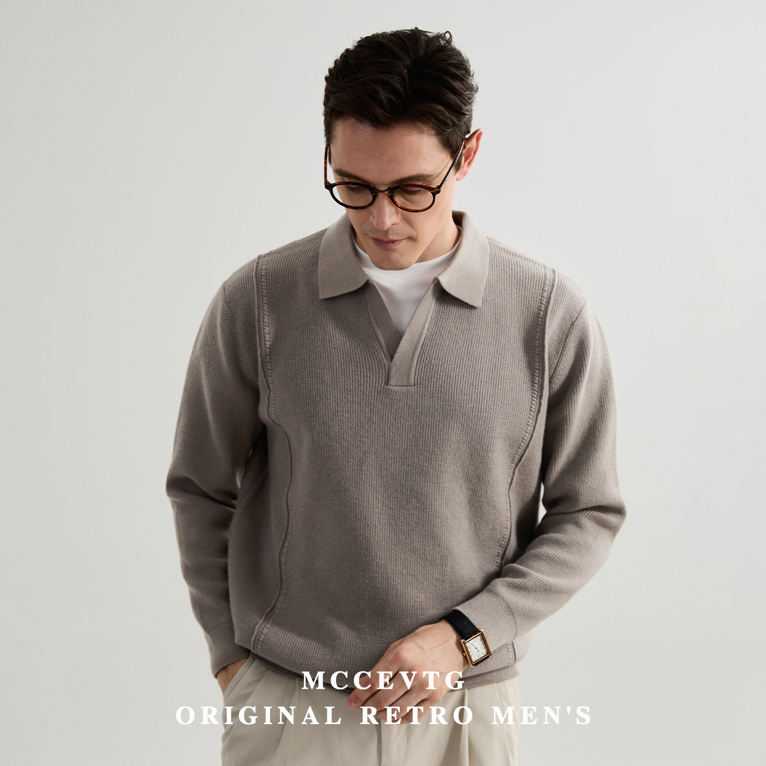 MCCEVTG意式老钱V领复古翻领毛衣长袖条纹提花休闲通勤加厚针织衫