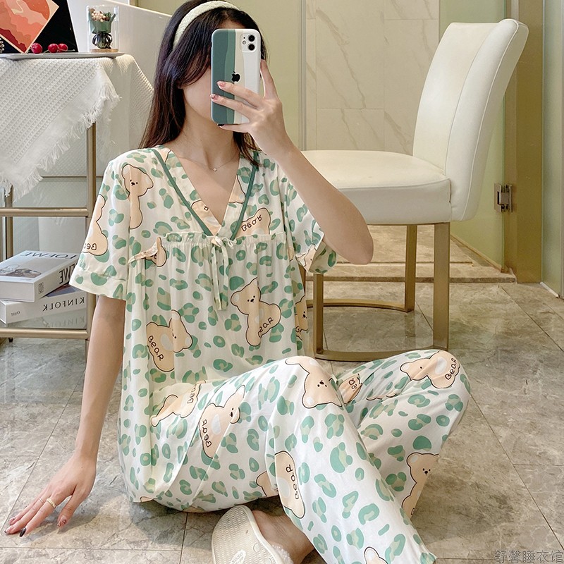 睡衣女夏季短袖长裤纯棉绸女装韩版绵绸薄款舒适可外穿家居服套装
