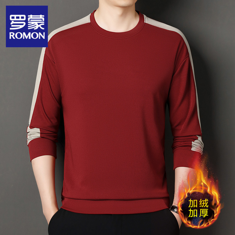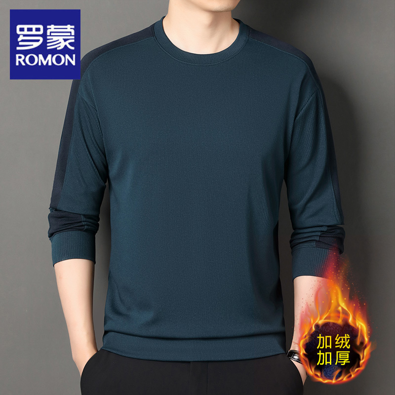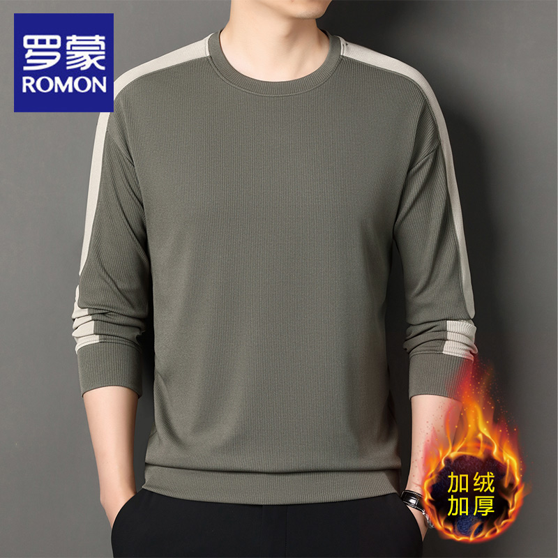 罗蒙圆领卫衣男款秋冬季加绒保暖2025新款商务休闲拼接T恤衫中年