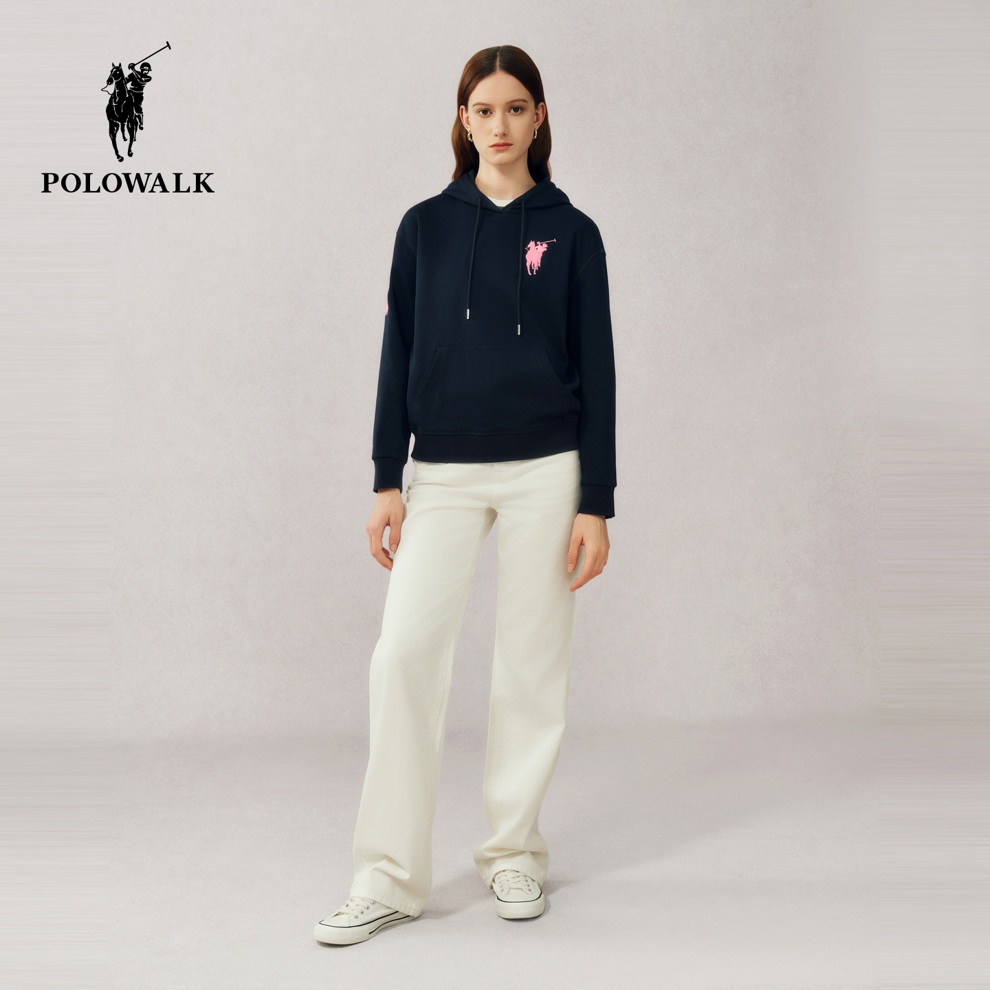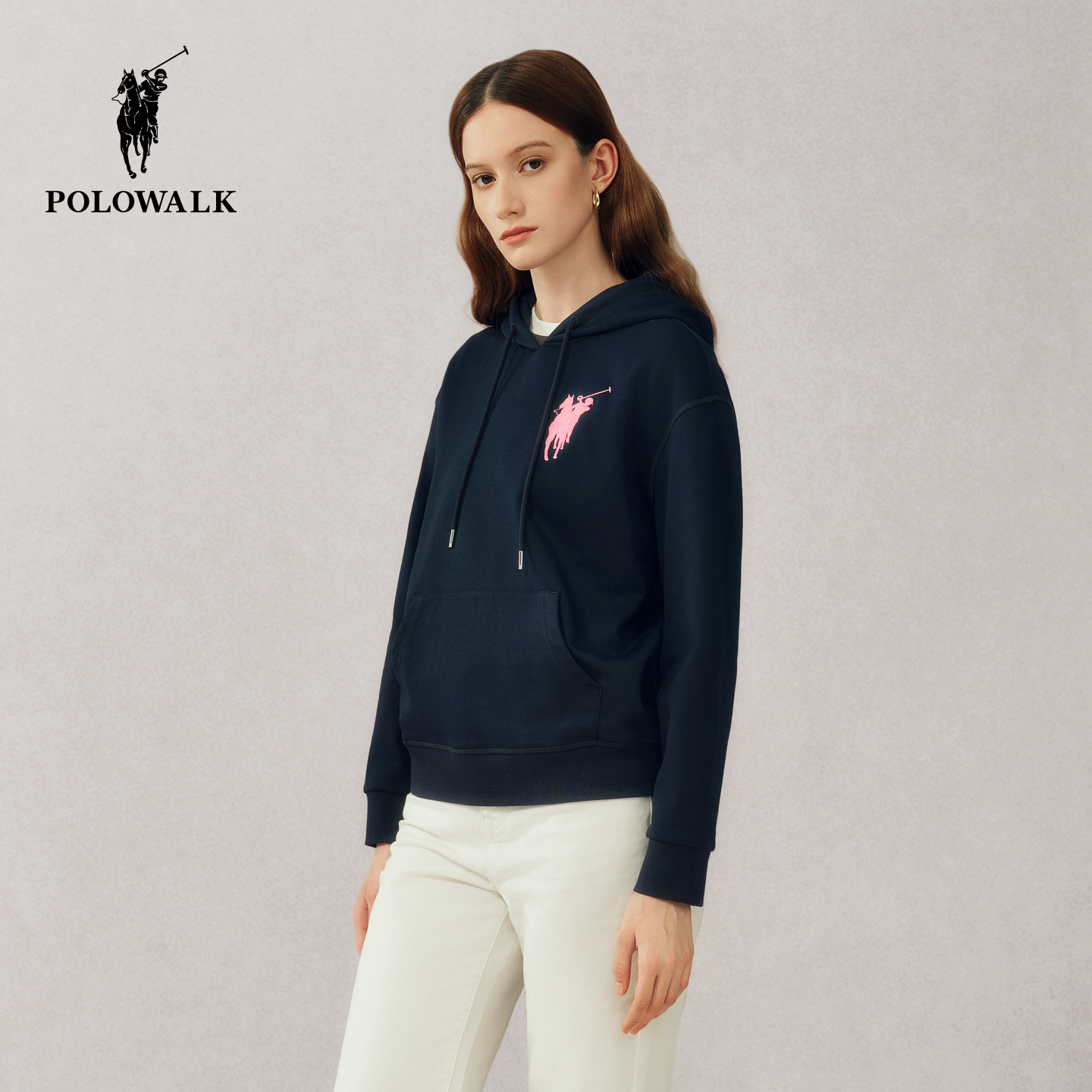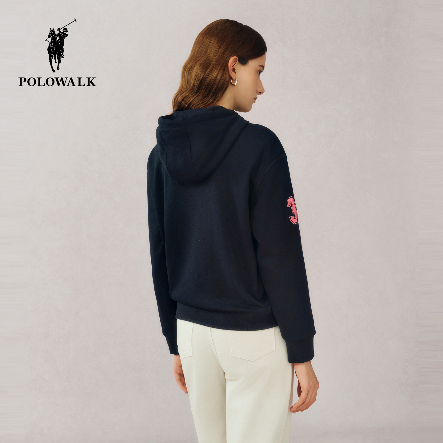 POLOWALK女士连帽加绒卫衣秋冬新款撞色学院风小个子简约卫衣外套