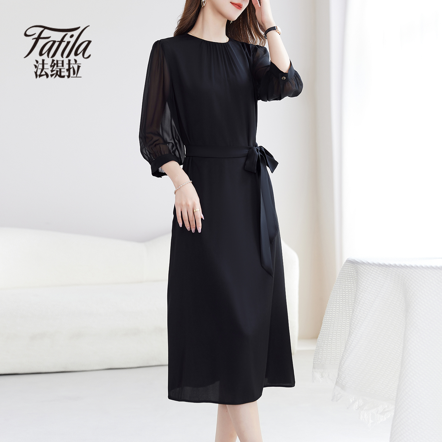高端黑色真丝连衣裙夏新款宽松直筒遮肚显瘦桑蚕丝裙子中长款气质
