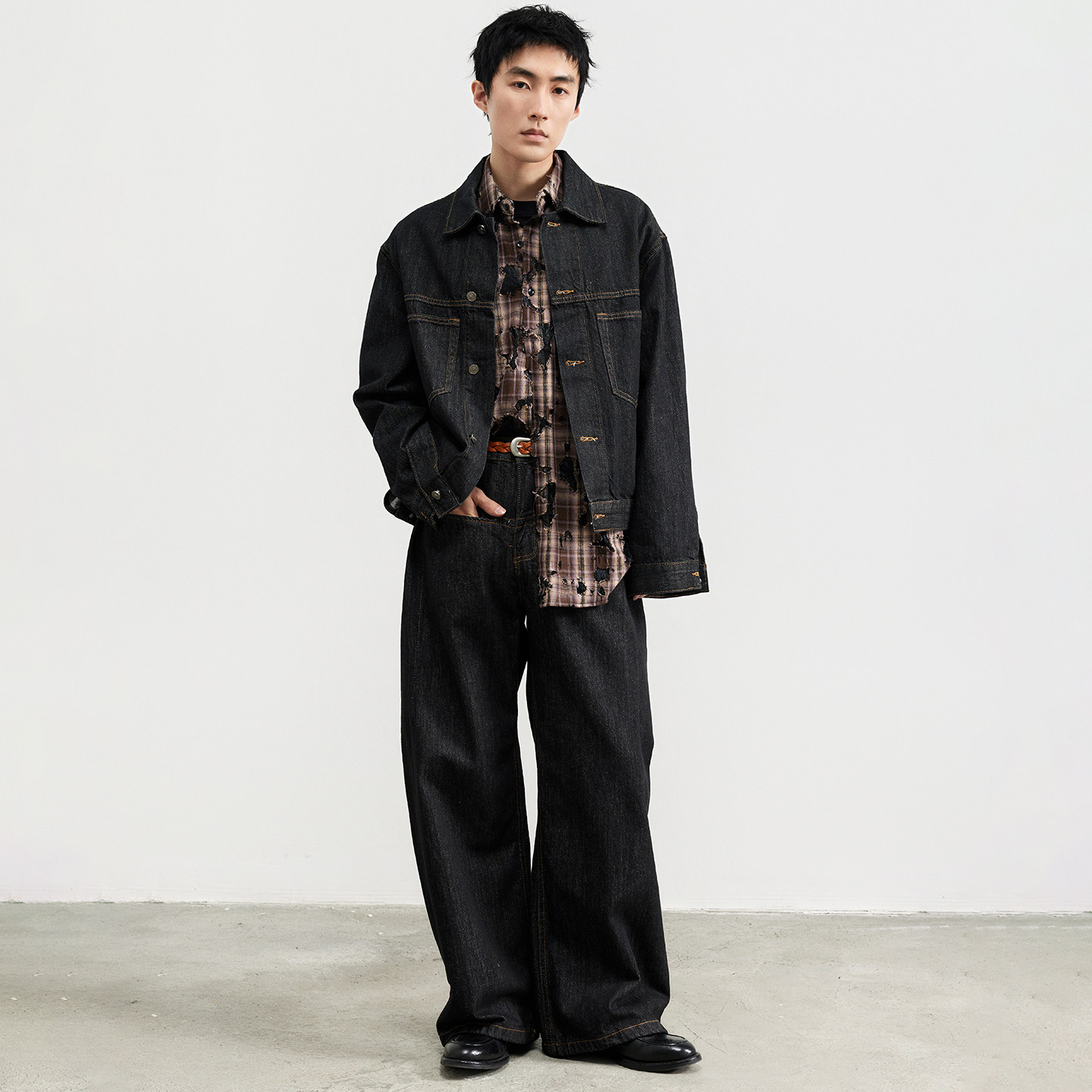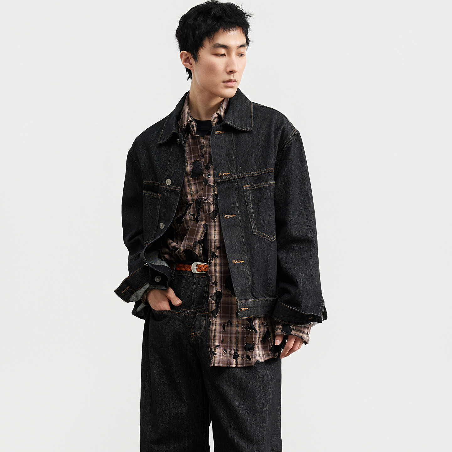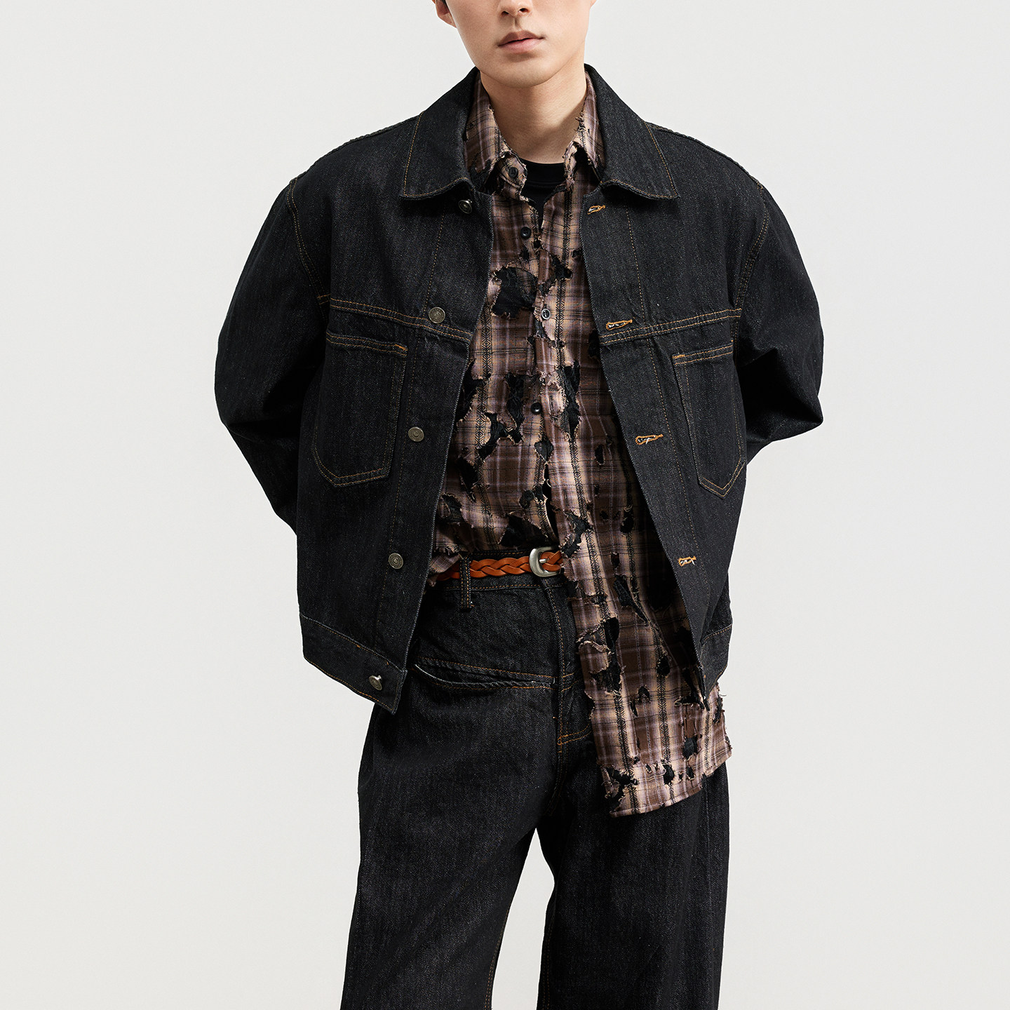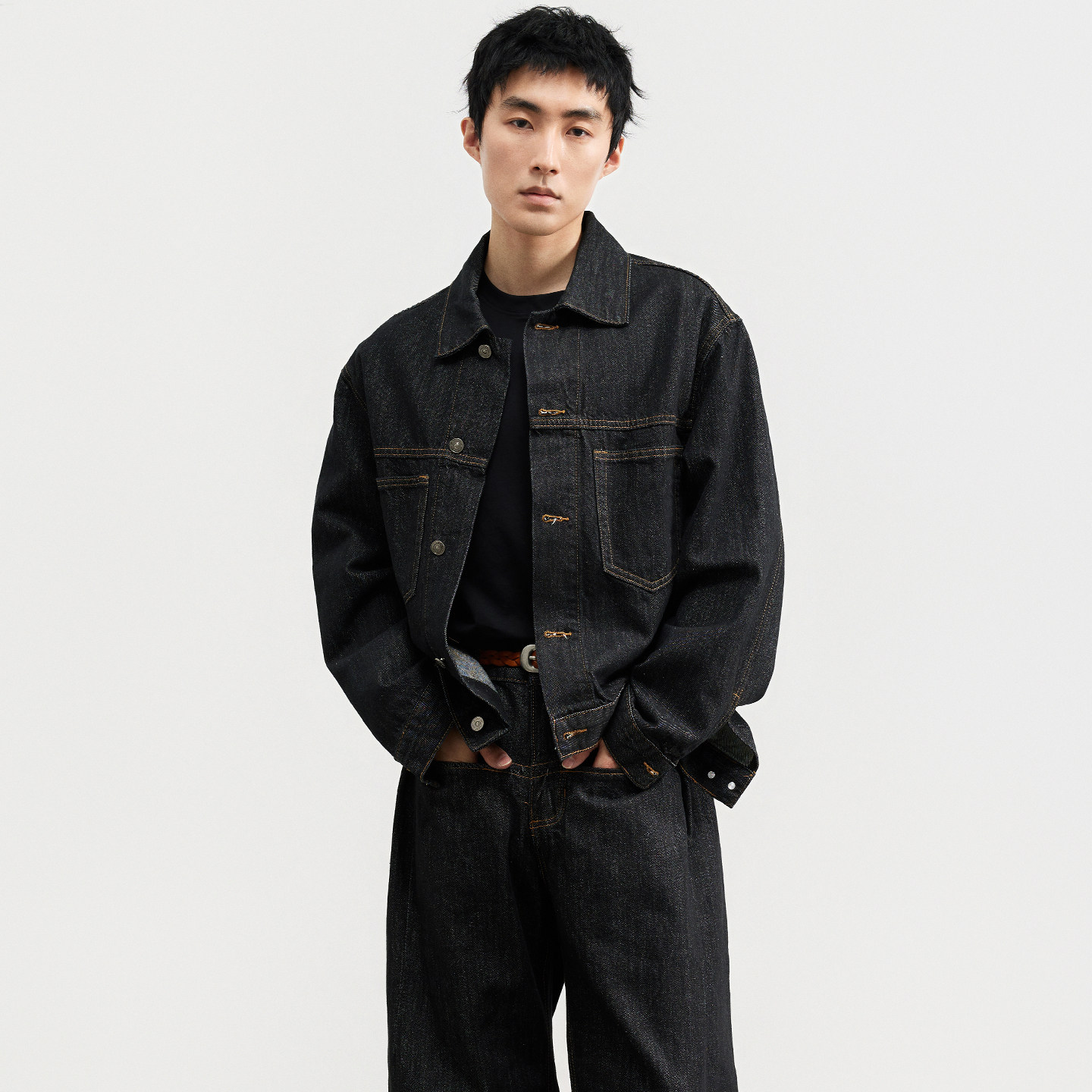 三木公白 短款复古原色牛仔外套男宽松 工装辑明线夹克简约精致潮