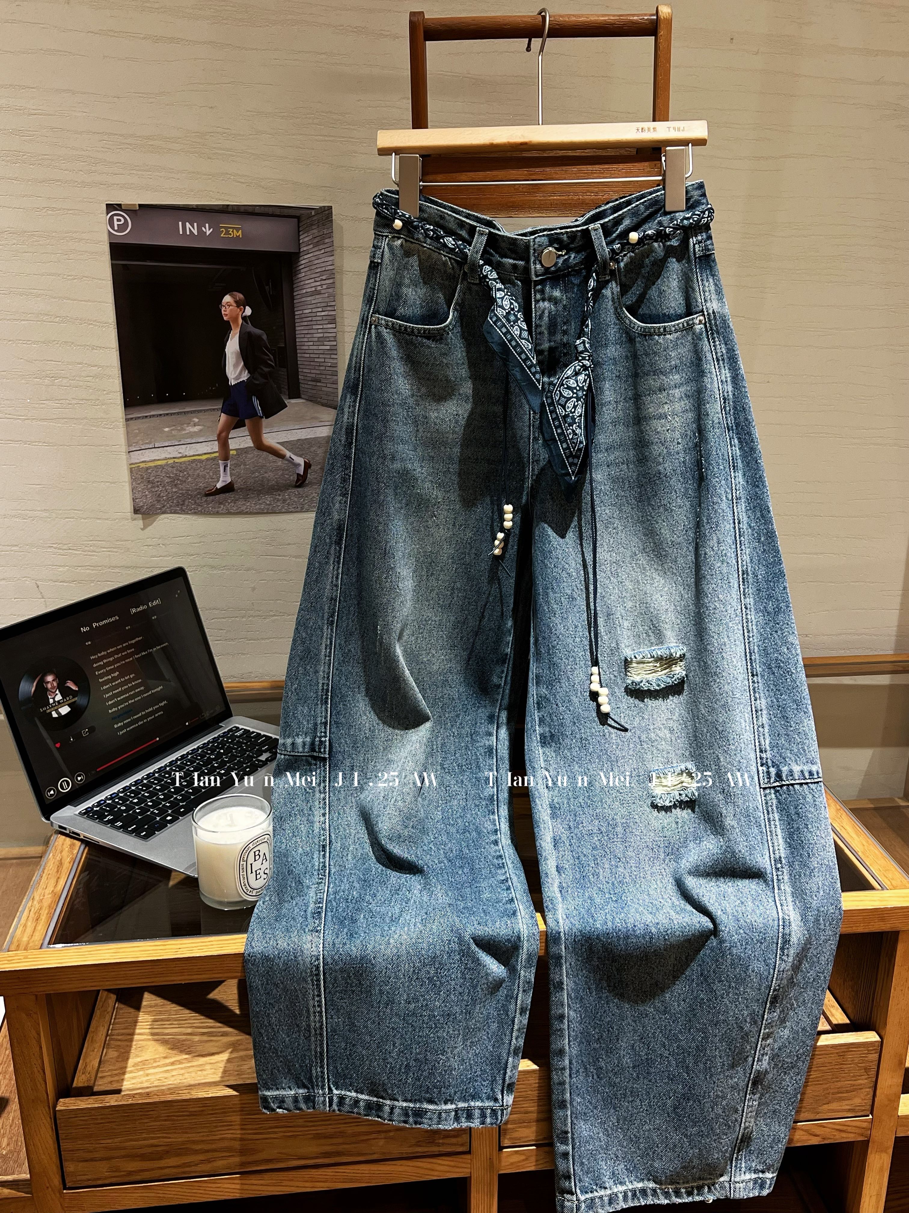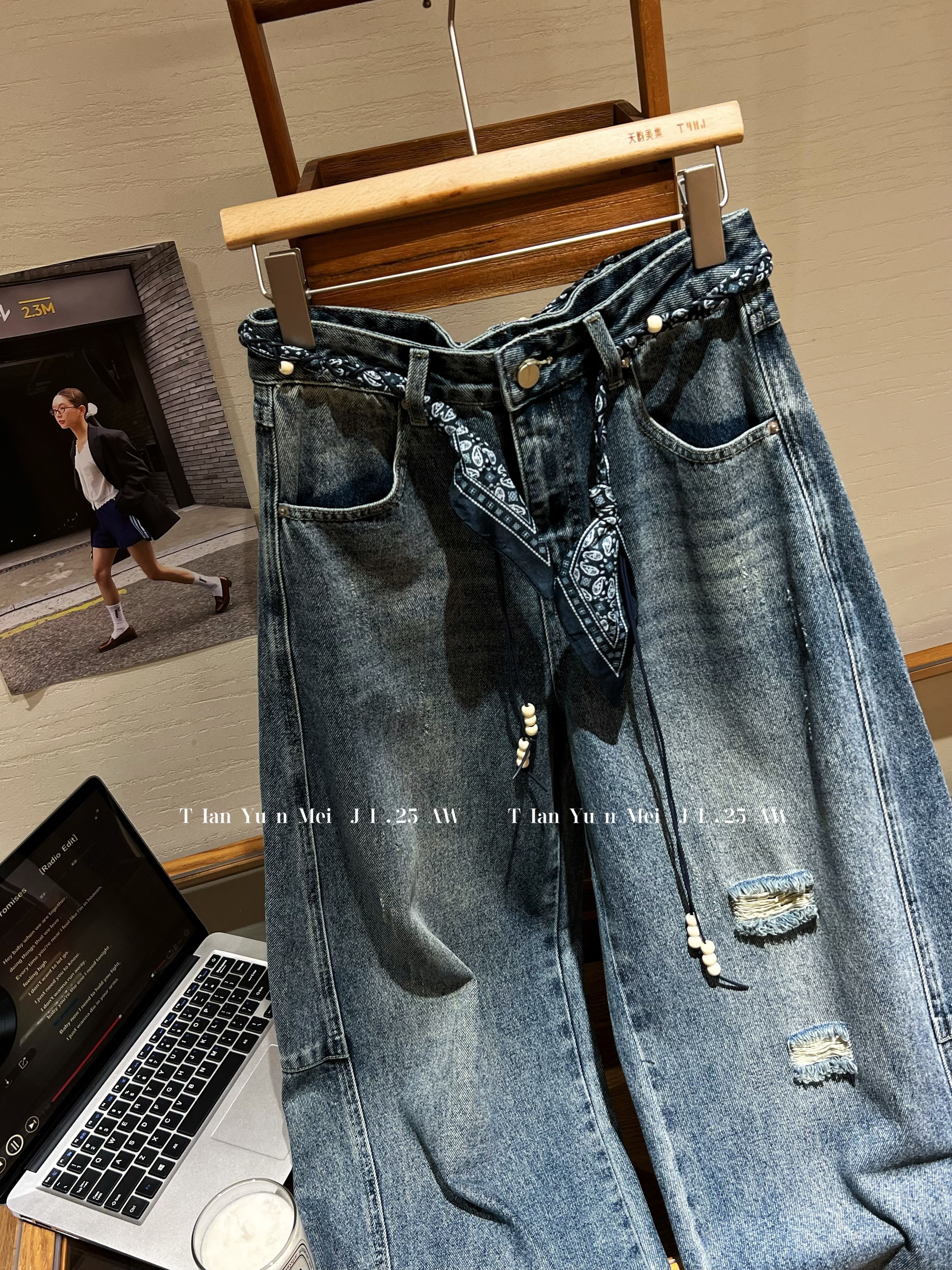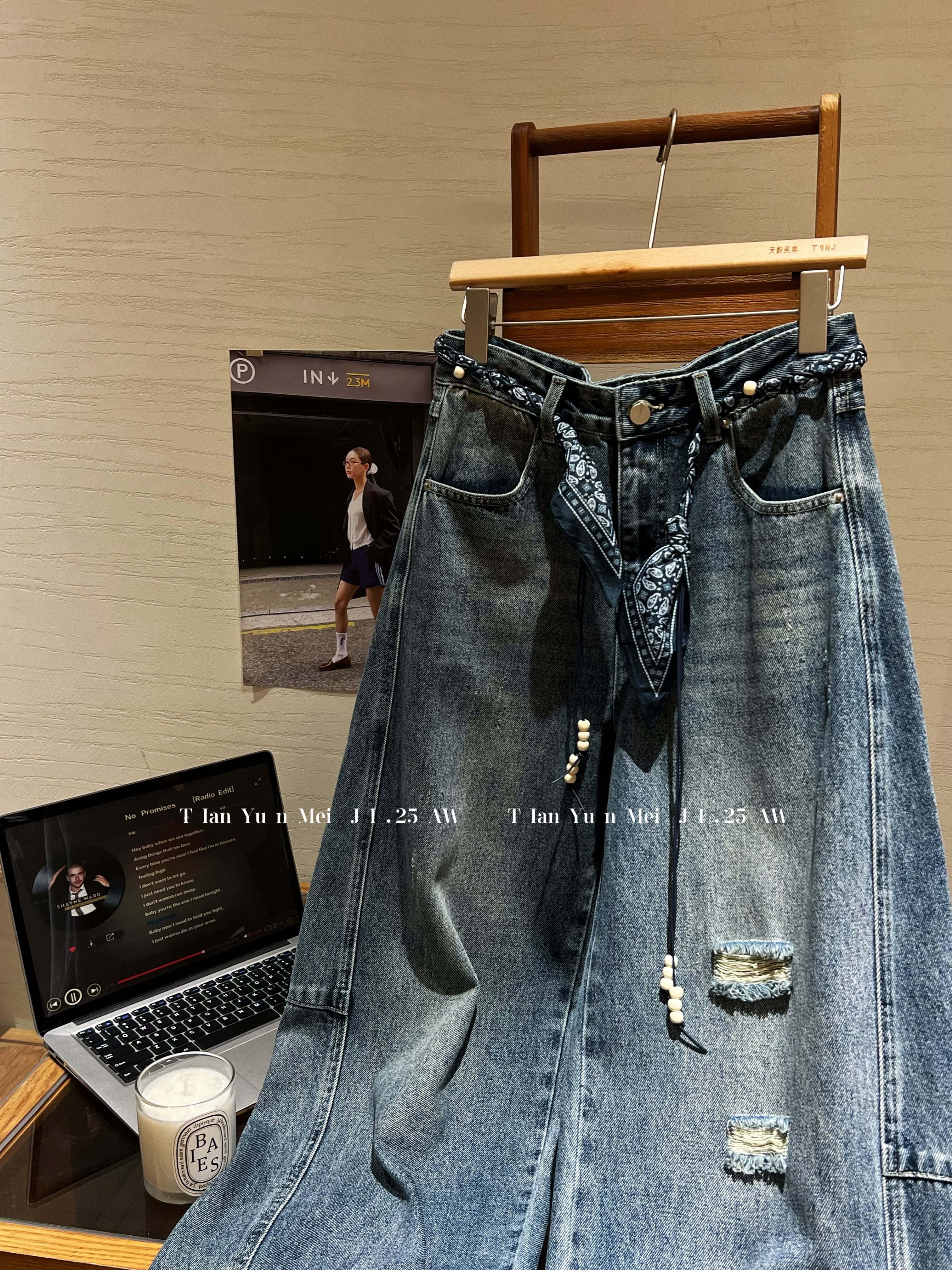 欧洲站2025秋季新款破洞水洗阔腿弯刀牛仔裤女配腰带设计感直筒裤