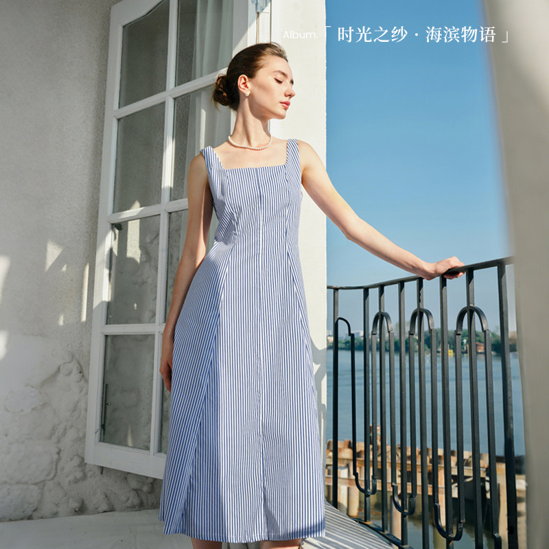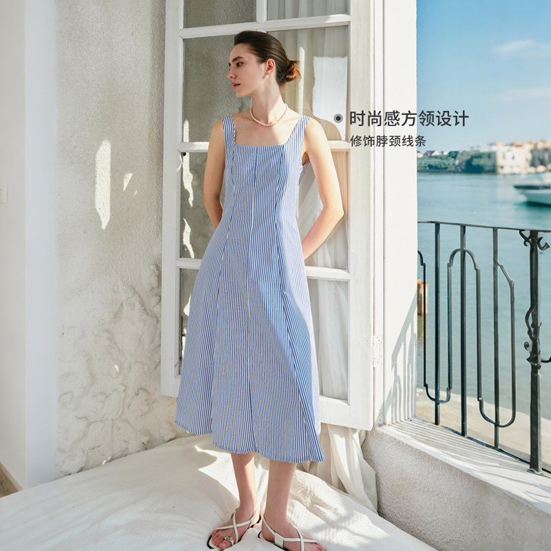 Navigare意大利小帆船百搭方领连衣裙女25夏季新款修身背带连身裙