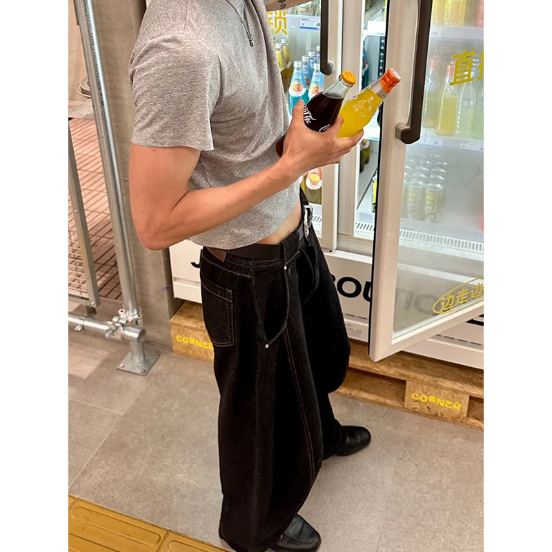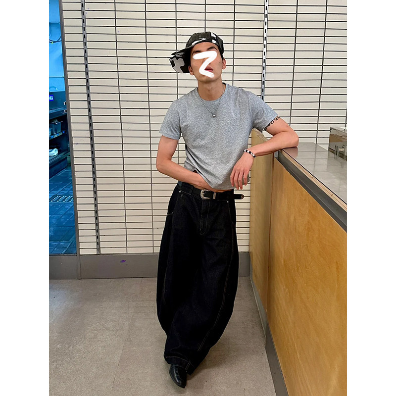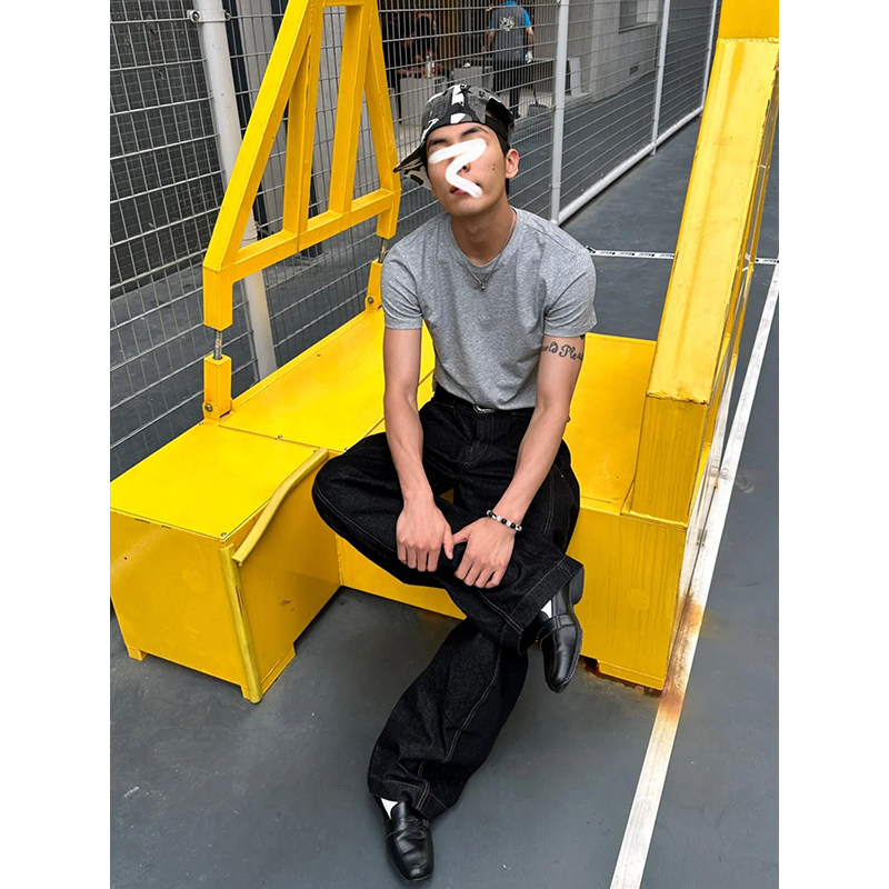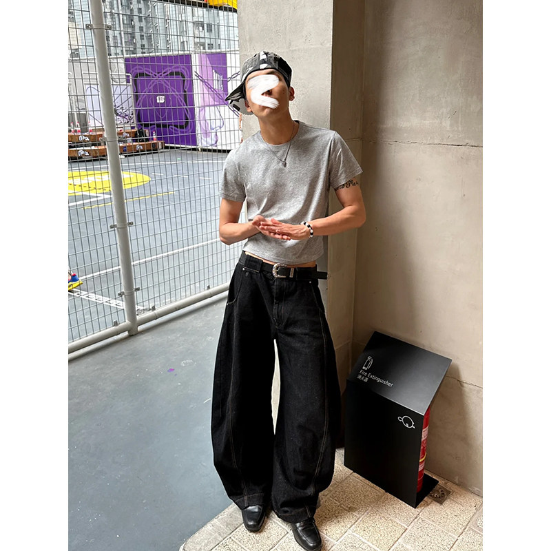 极简ALLBLACK弯刀牛仔裤男cleanfit街头复古水洗宽松休闲镰刀裤子