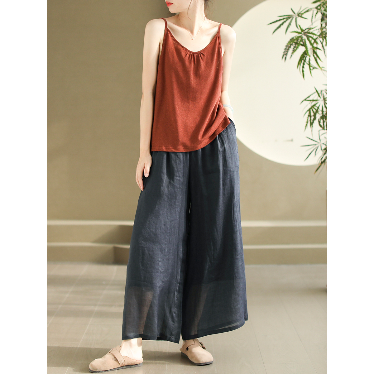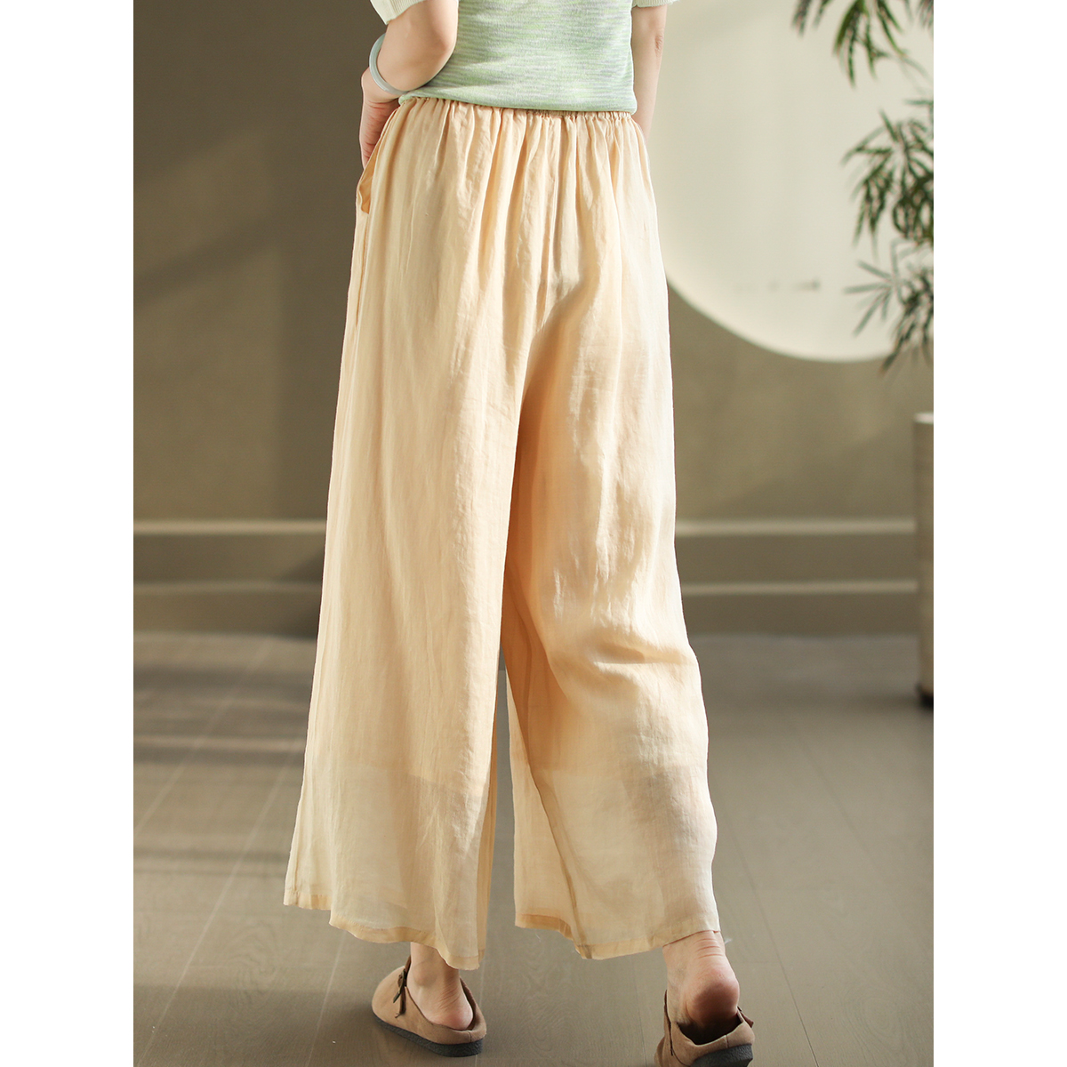 代勒原创夏季新款100%苎麻休闲裤女文艺双层松紧腰薄款飘逸阔腿裤