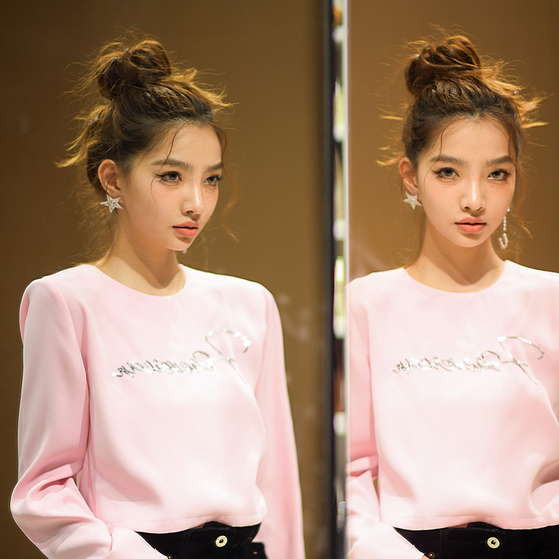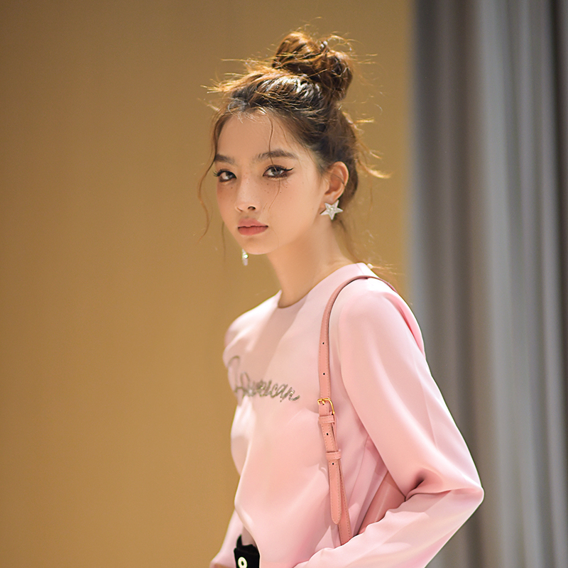 Forevercan 2022春夏短款蔷薇粉长袖打底t恤女百搭显瘦上衣