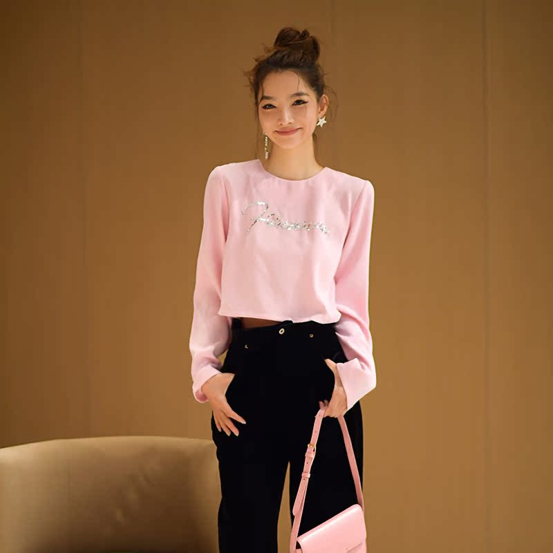 手工立裁亮片蔷薇粉t恤