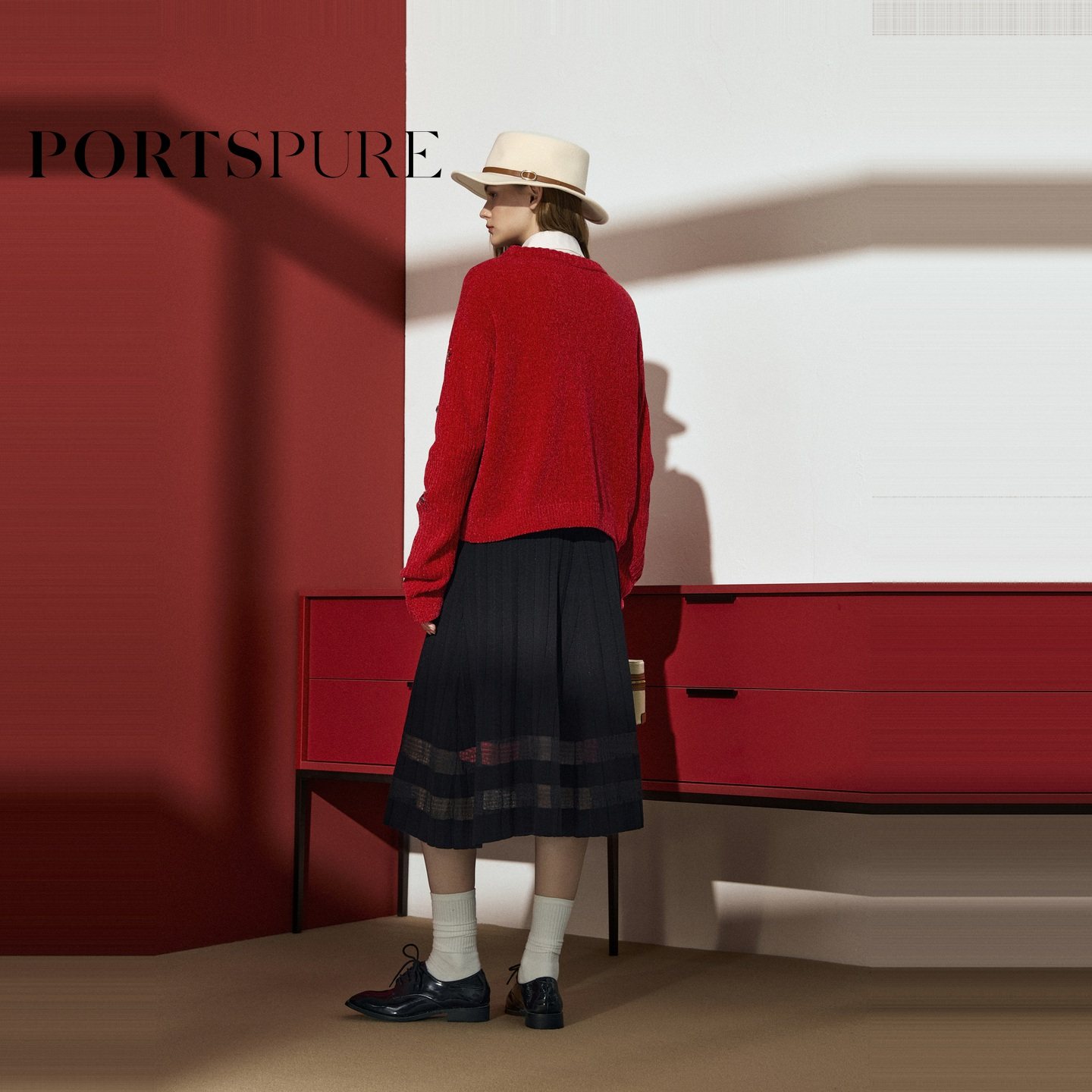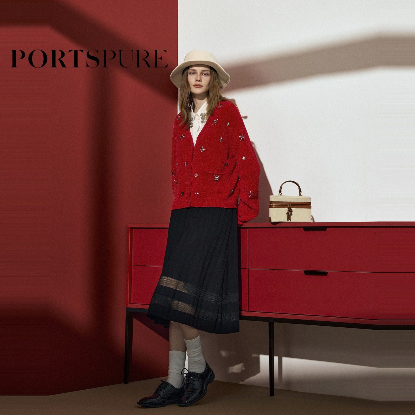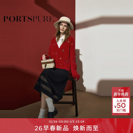 宝姿PORTSPURE女装2026早春新品手缝钻珠V领针织短款开衫