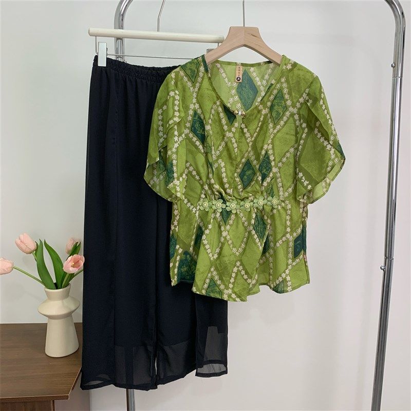 妈妈夏装洋气时尚套装2025新款中老年女装短袖雪纺小衫上衣两件套