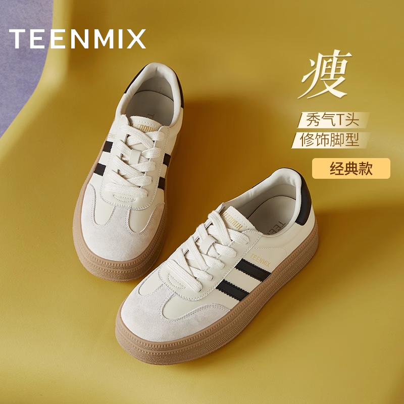 天美意彩虹蛋糕厚底增高红色阿甘德训鞋女鞋双鞋带运动板鞋休闲鞋