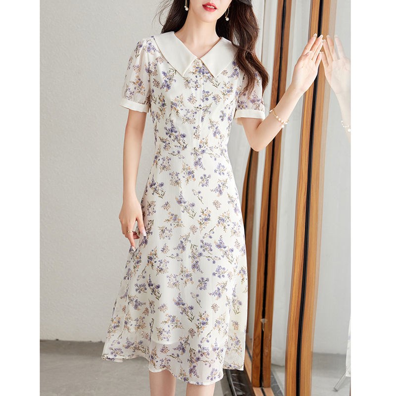 2025温柔风翻领碎花连衣裙女夏季浪漫气质收腰雪纺茶歇法式裙子
