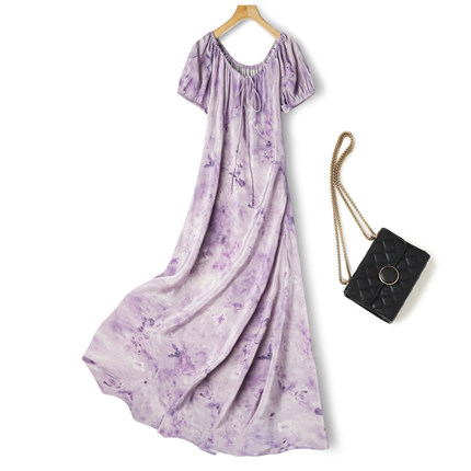 法式新款桑蚕丝斜裁连衣裙真丝双绉减龄系带紫色蝴蝶短袖长裙女