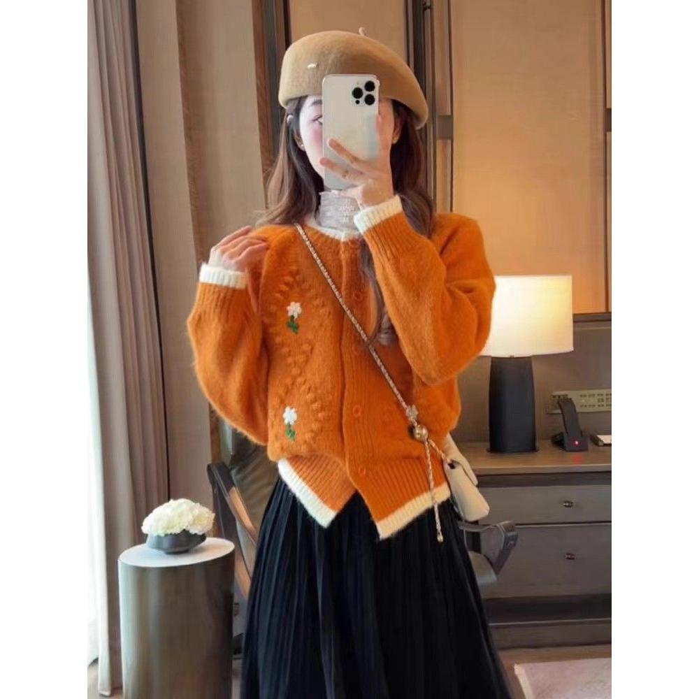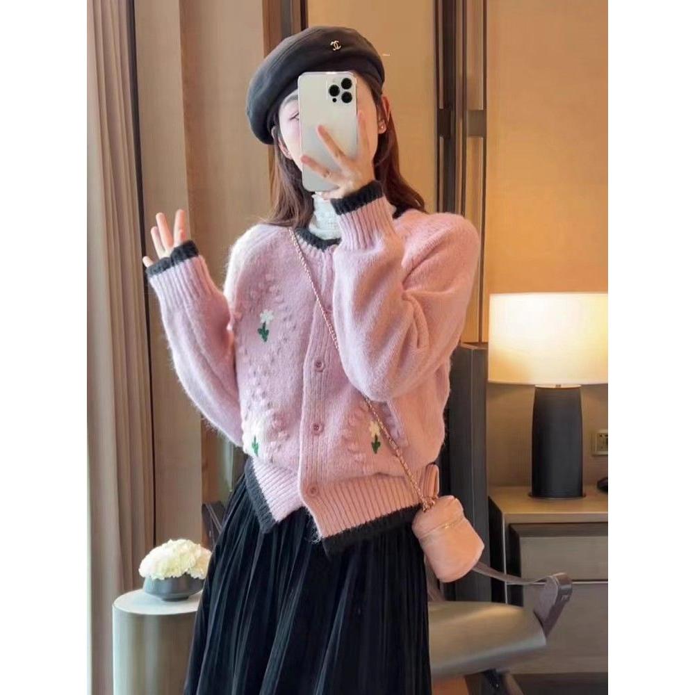 小香风设计感刺绣小花朵简约长袖女毛衣外套新款圆领简约百搭高级