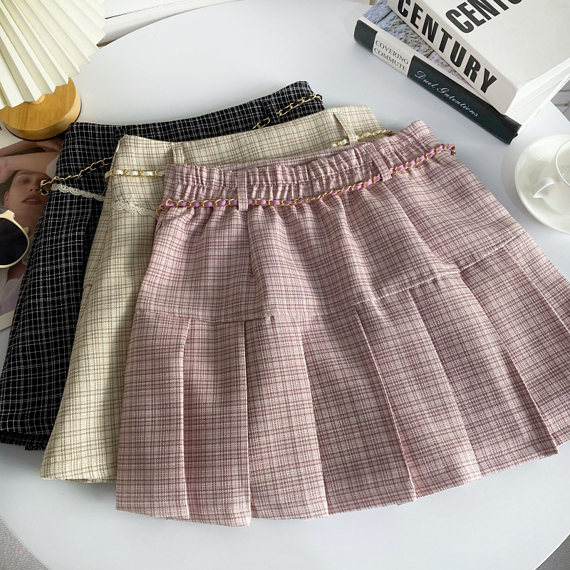 甜美chic小香风格纹百褶短裙春夏新款高腰A字防走光半身裙配腰带