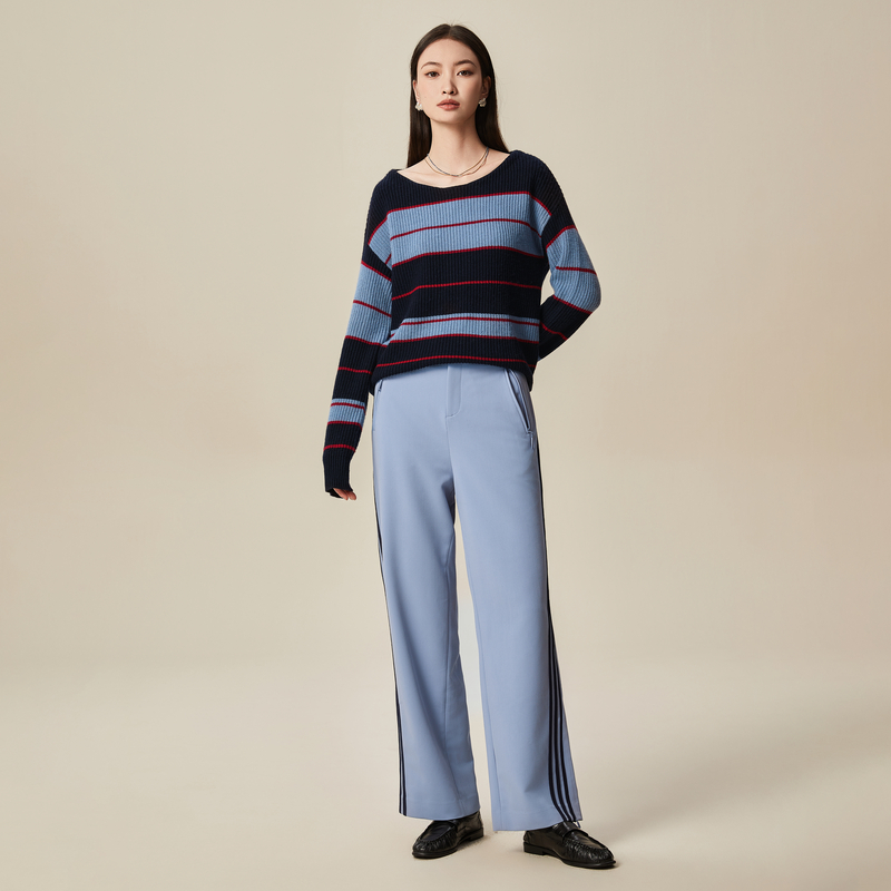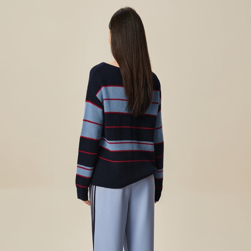 XG雪歌撞色条纹设计毛针织衫时尚春季新款长袖圆领绵羊毛毛衫女装