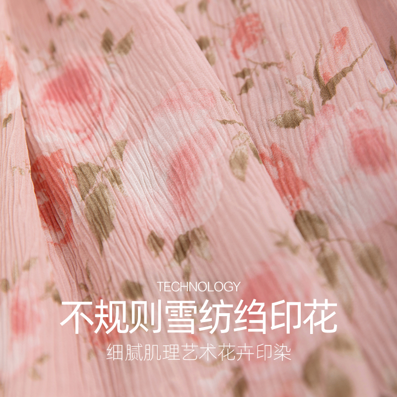 美妃连衣裙子女装春日碎花裙长裙高级法式印花绉气质甜海边松紧腰
