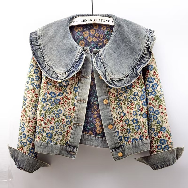 2025春季新款荷叶边娃娃领减龄牛仔外套女短款提花百搭长袖上衣潮