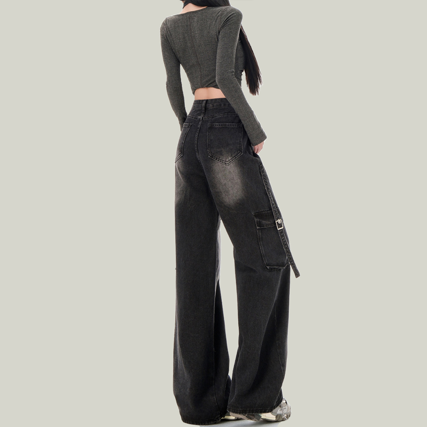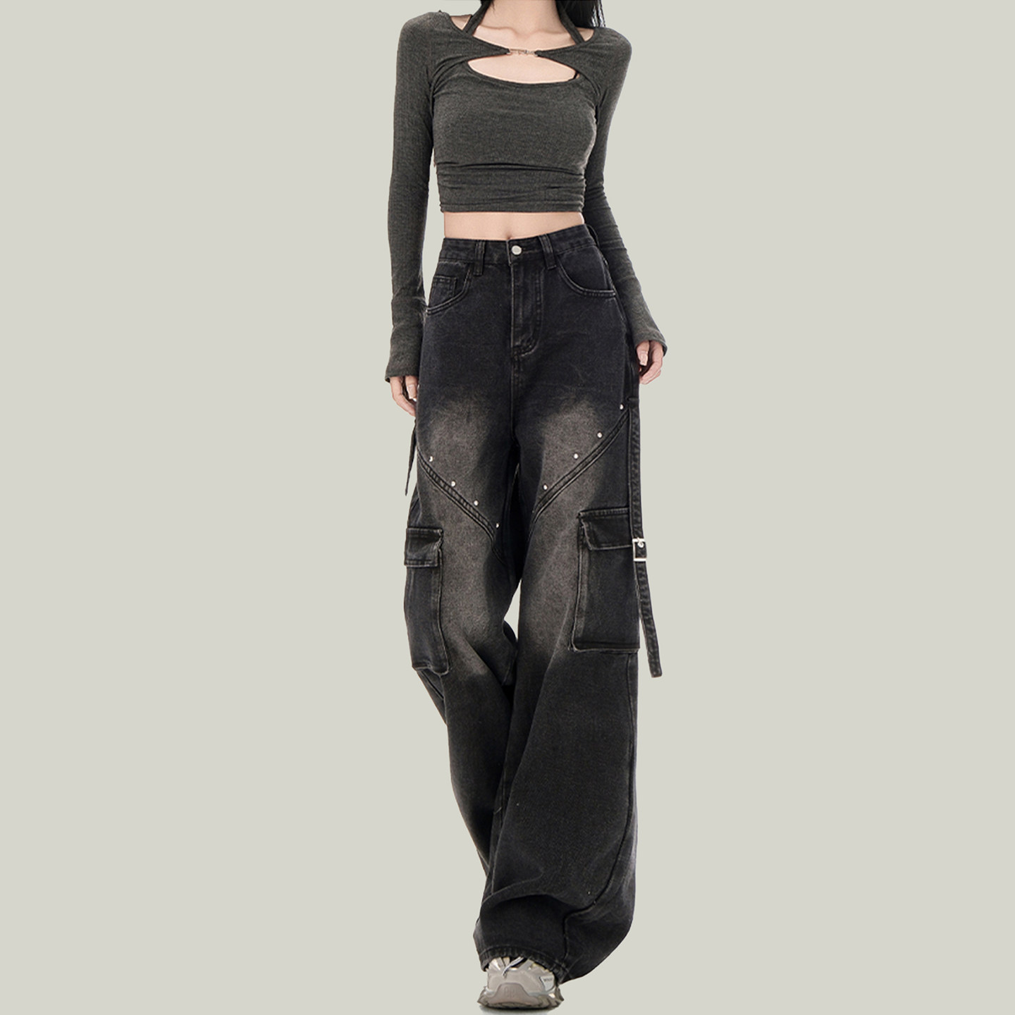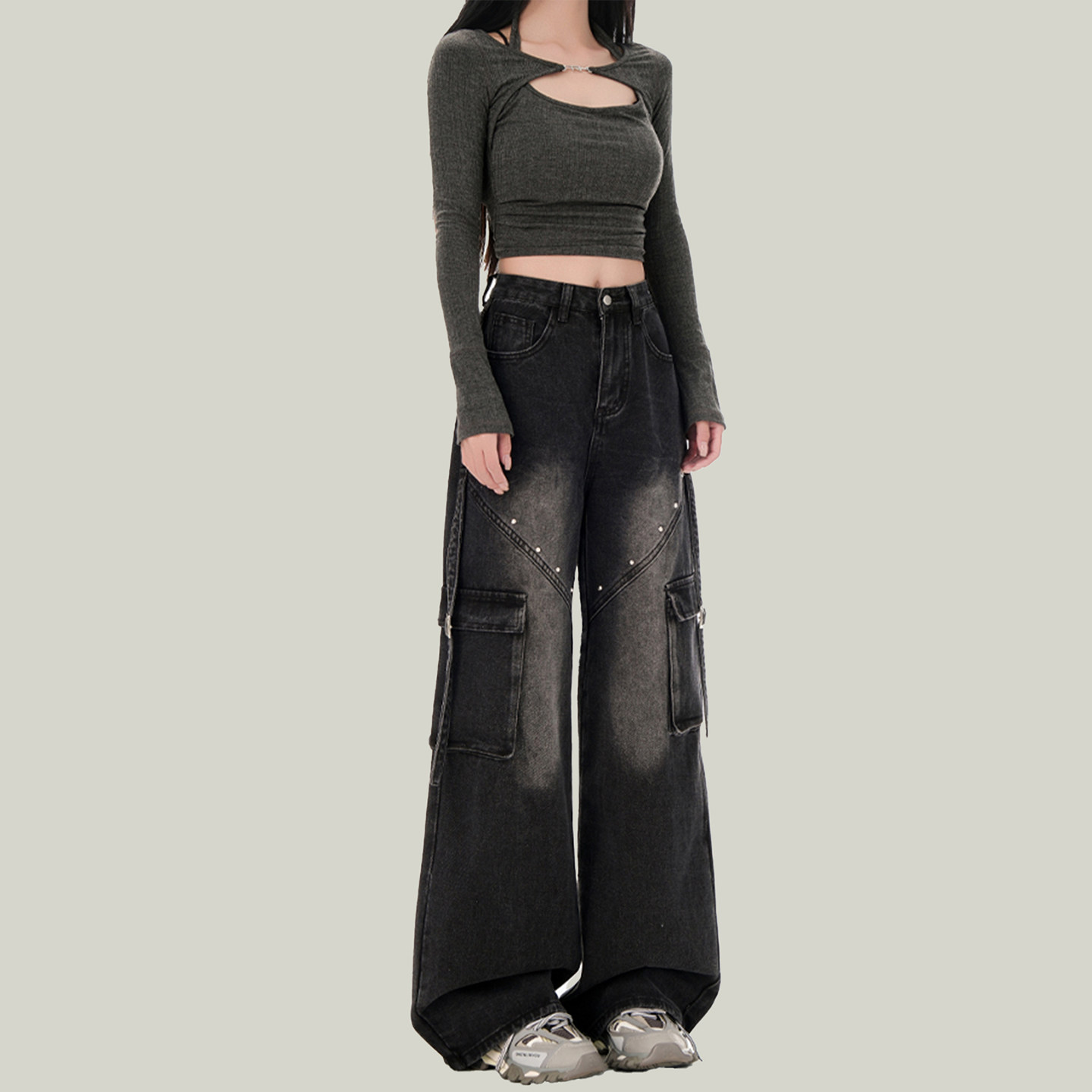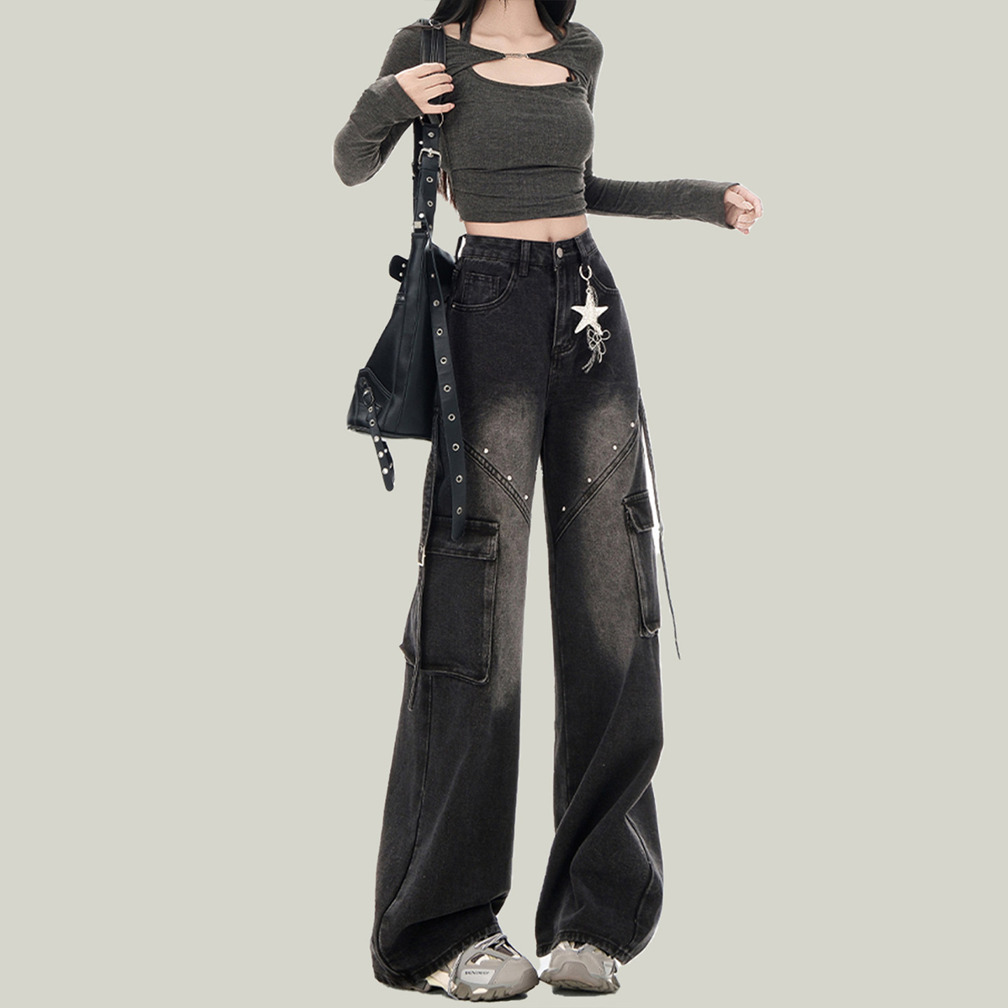 高街复古黑色铆钉工装牛仔裤女显瘦设计感高腰宽松美式阔腿长裤子