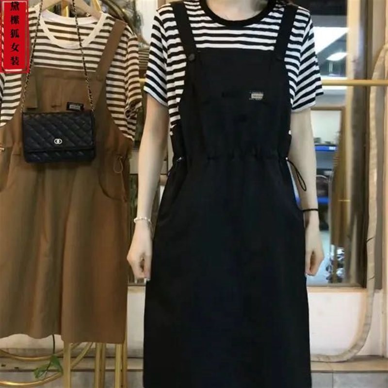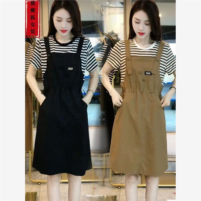 时尚假两件条纹拼接连衣裙女2024夏季新款收腰显瘦遮肚背带中长裙