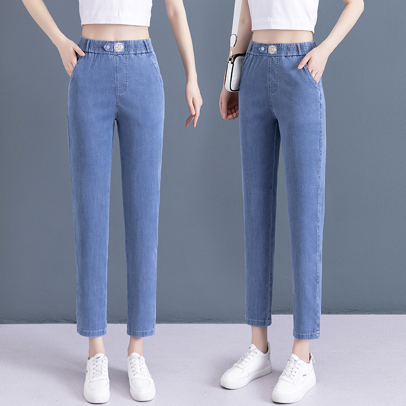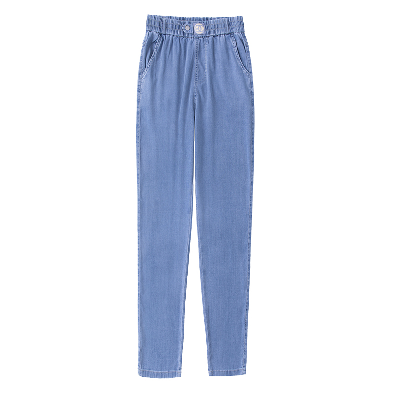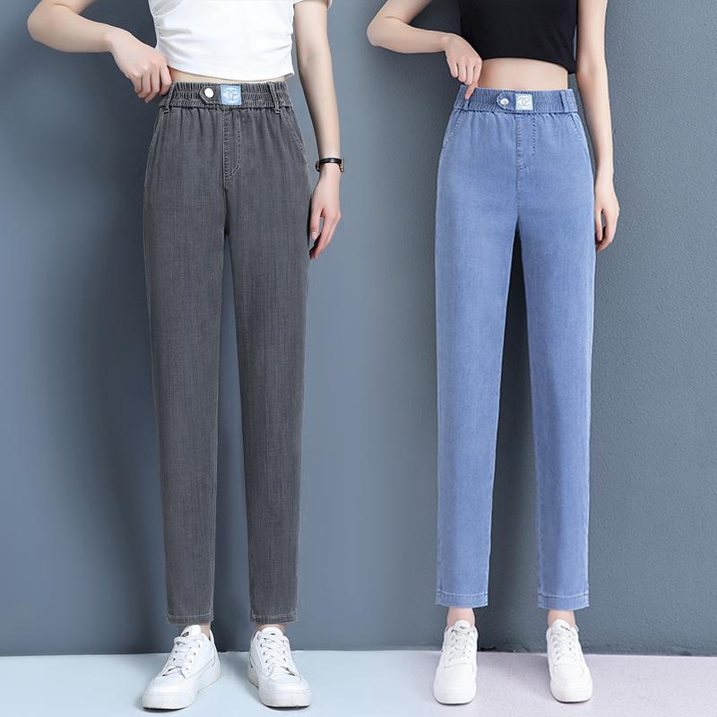 高腰天丝牛仔裤女九分薄款松紧腰2025年春夏宽松冰丝小个子哈伦裤