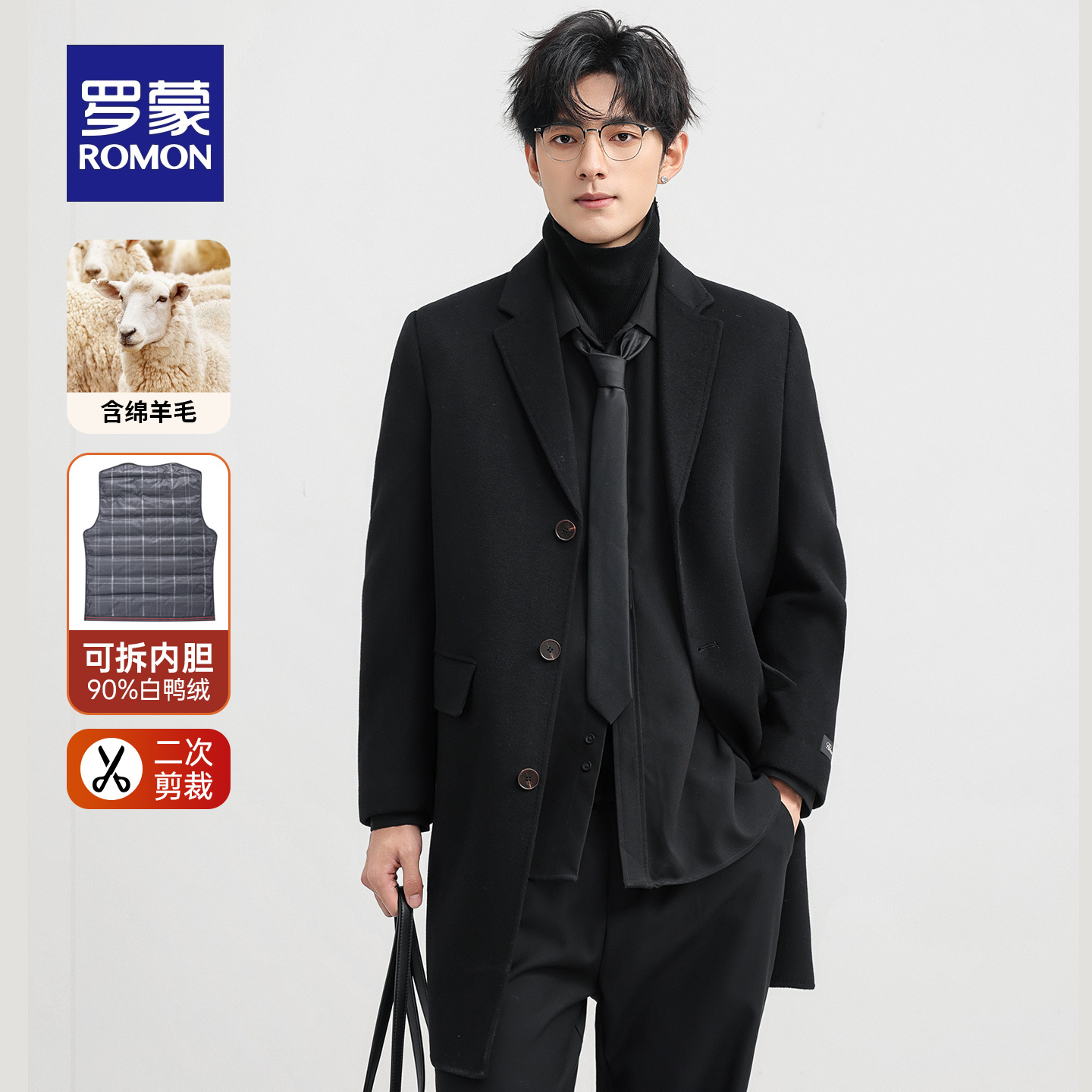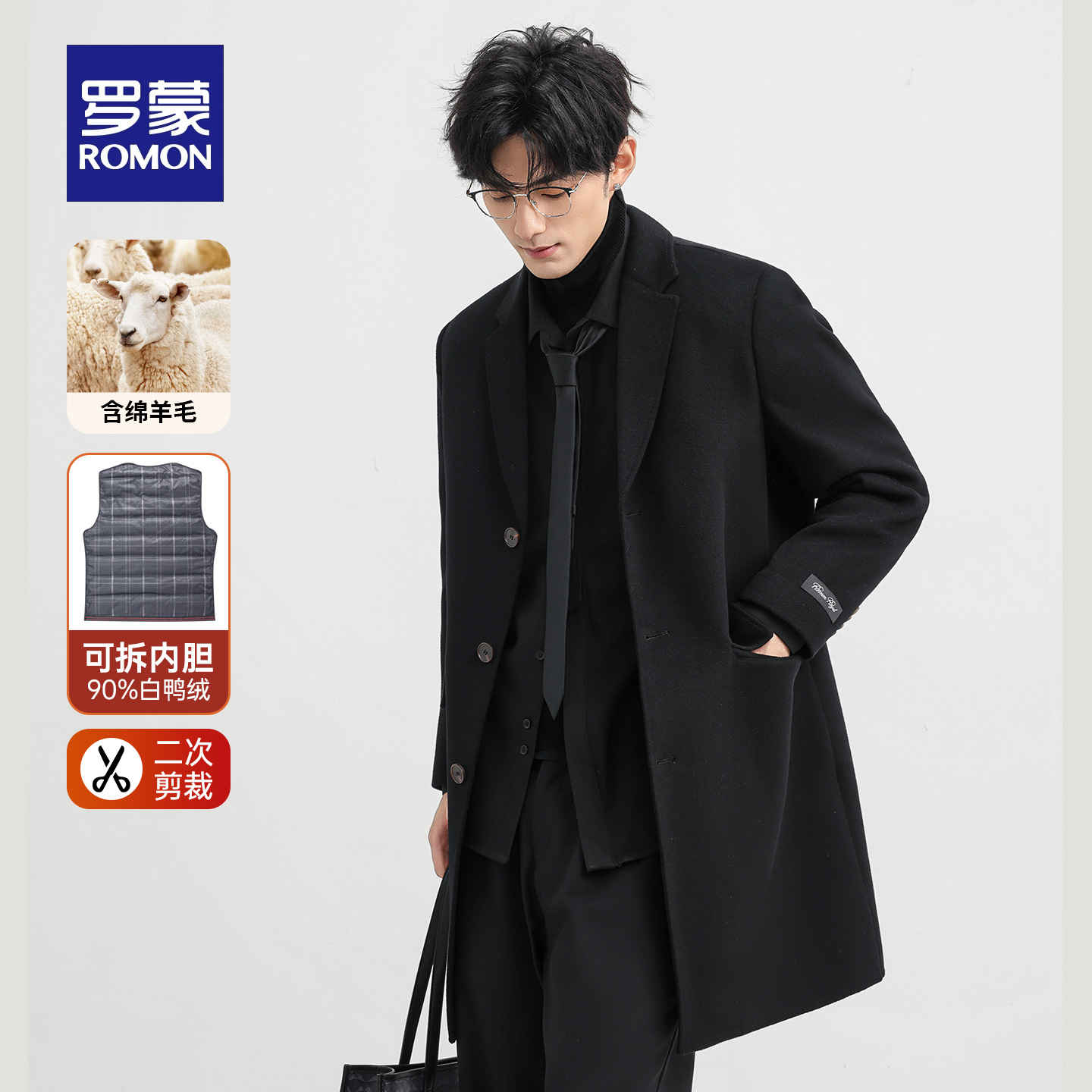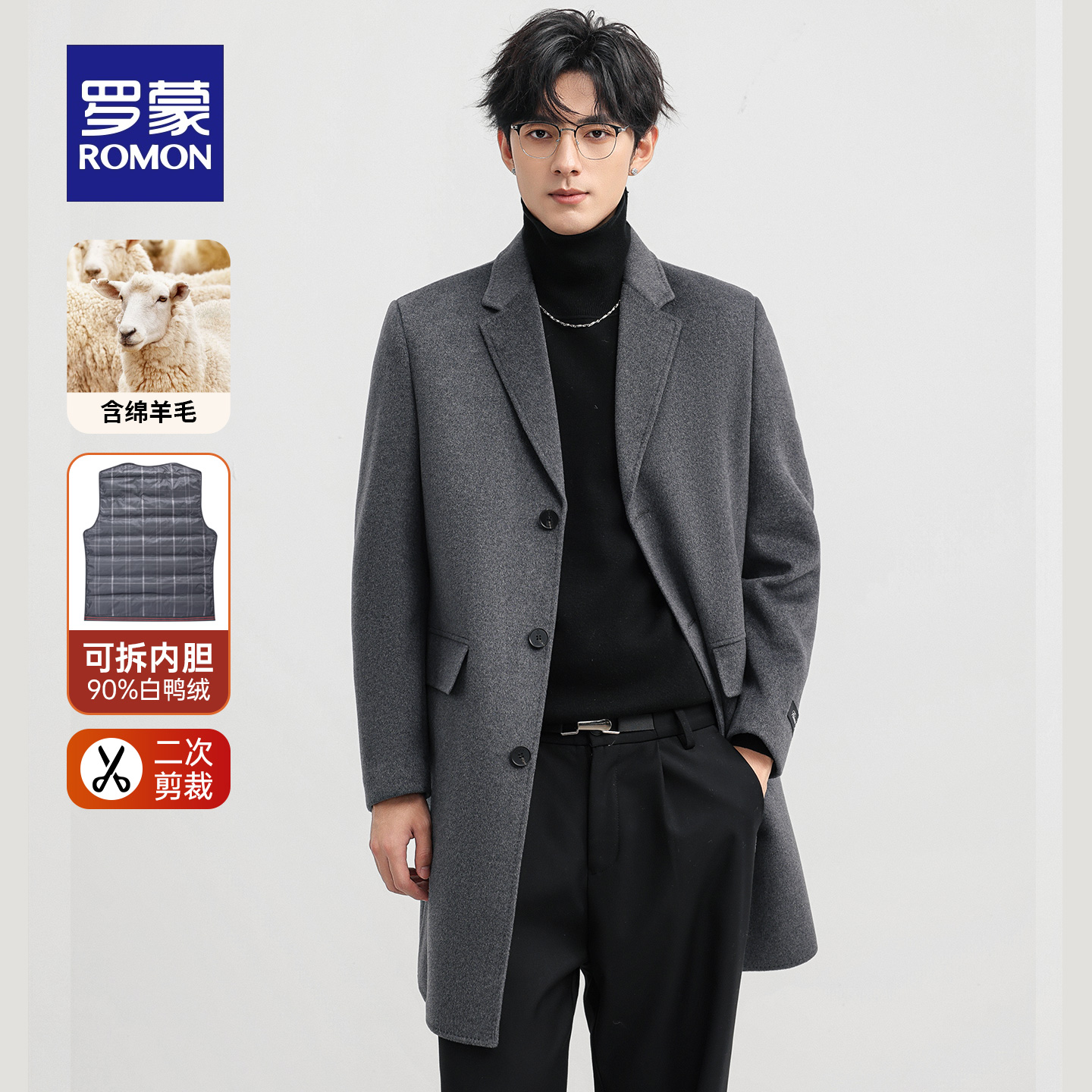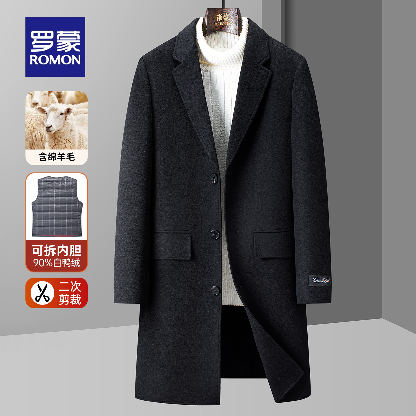 【含山羊绒】罗蒙男中长款毛呢双面呢大衣冬季可拆卸羽绒内胆外套