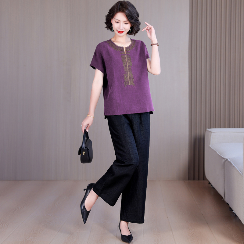 新中式国风香云纱真丝套装宽松上衣阔腿裤两件套中老年时尚妈妈装
