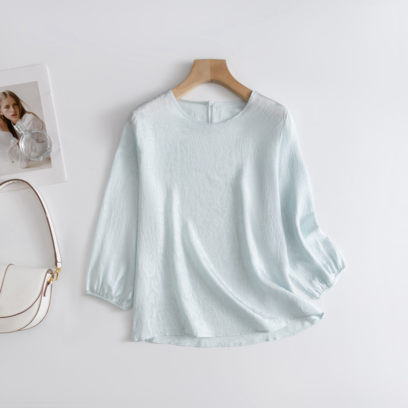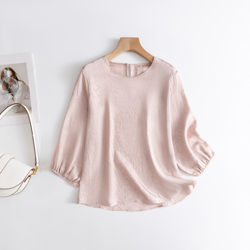 新款真丝冠乐绉上衣女圆领套头显瘦小衫桑蚕丝七分袖外穿上衣夏季
