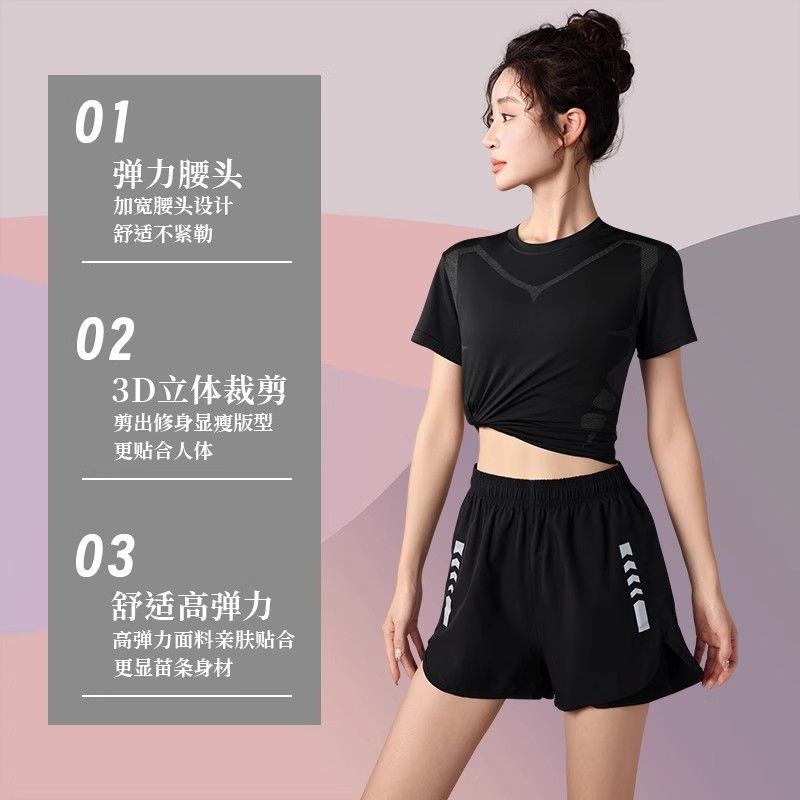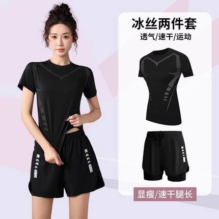 跑步运动套装女夏季速干冰丝t恤瑜伽服大码短袖晨跑健身衣服高弹
