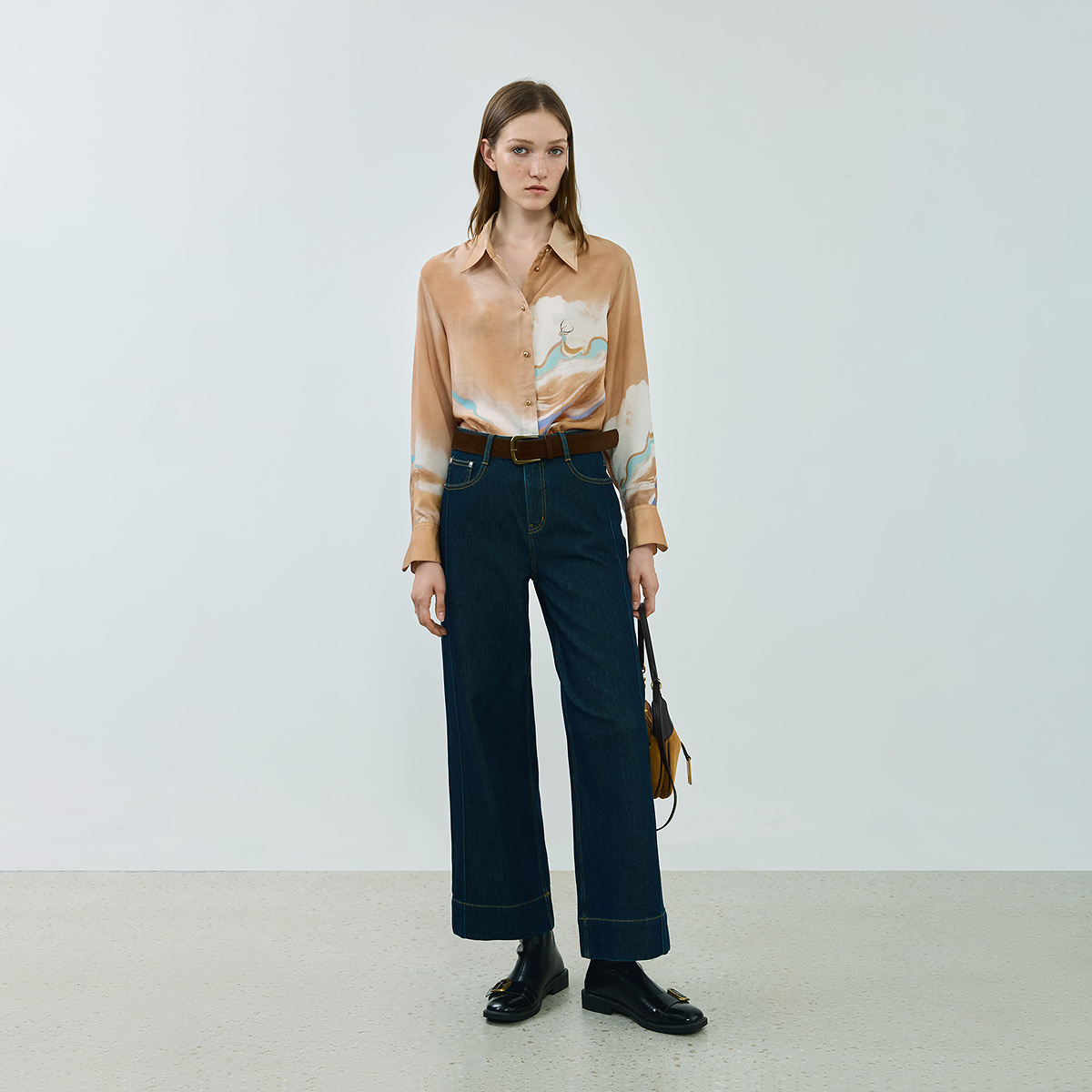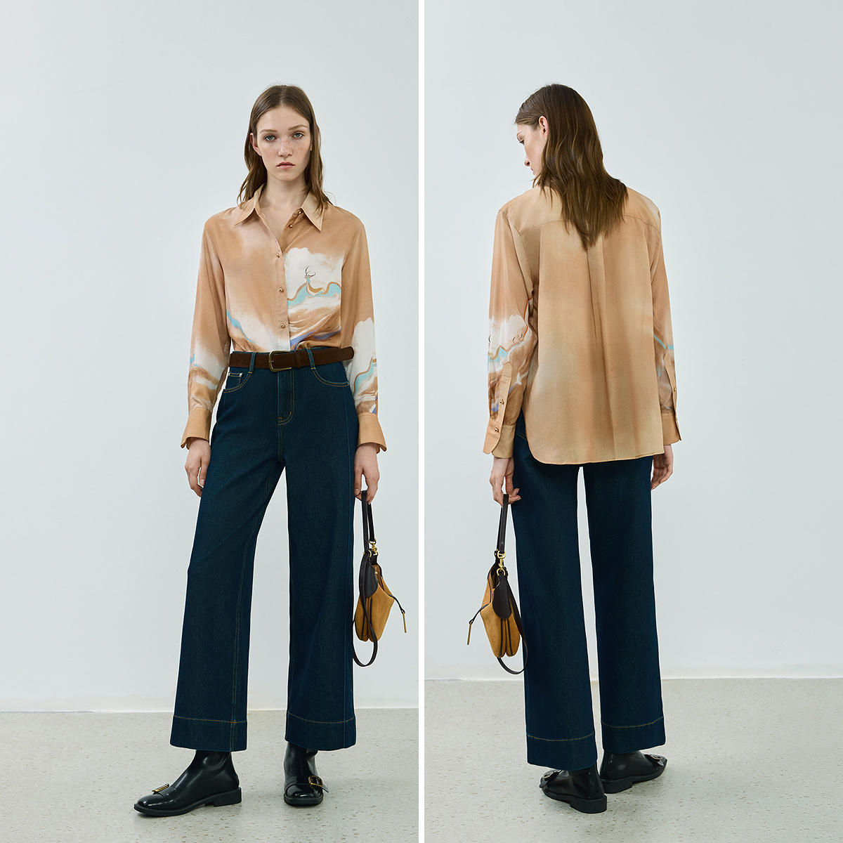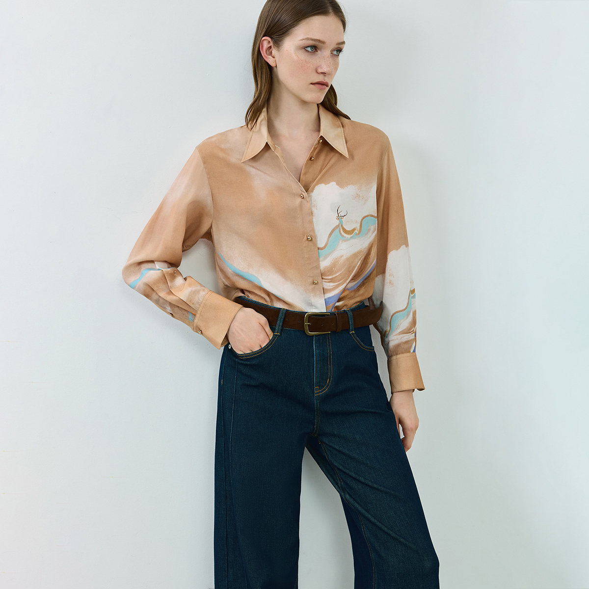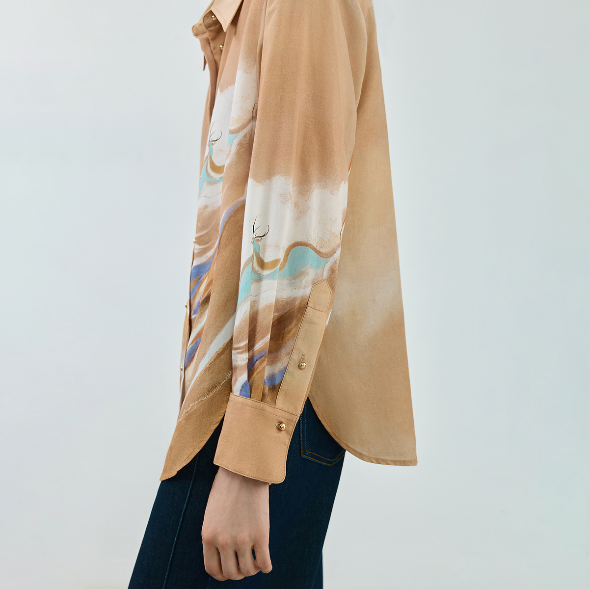 敦煌系列LILY2025秋新款女装莱赛尔亚麻印花气质通勤浅色衬衫外套