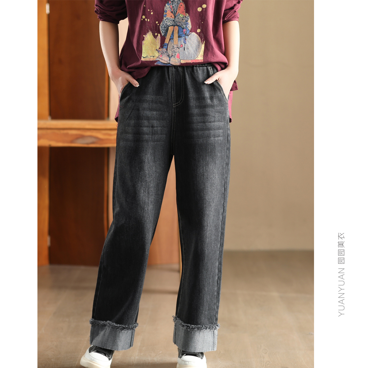 园园美衣新款复古水洗牛仔裤女个性翻边直筒裤窄版显瘦文艺长裤春