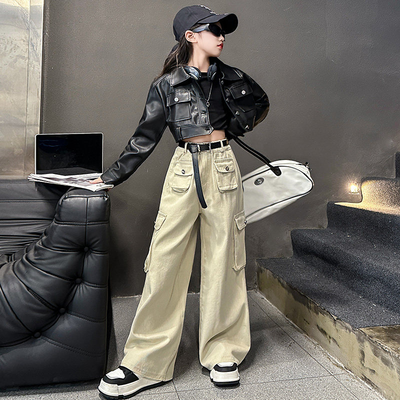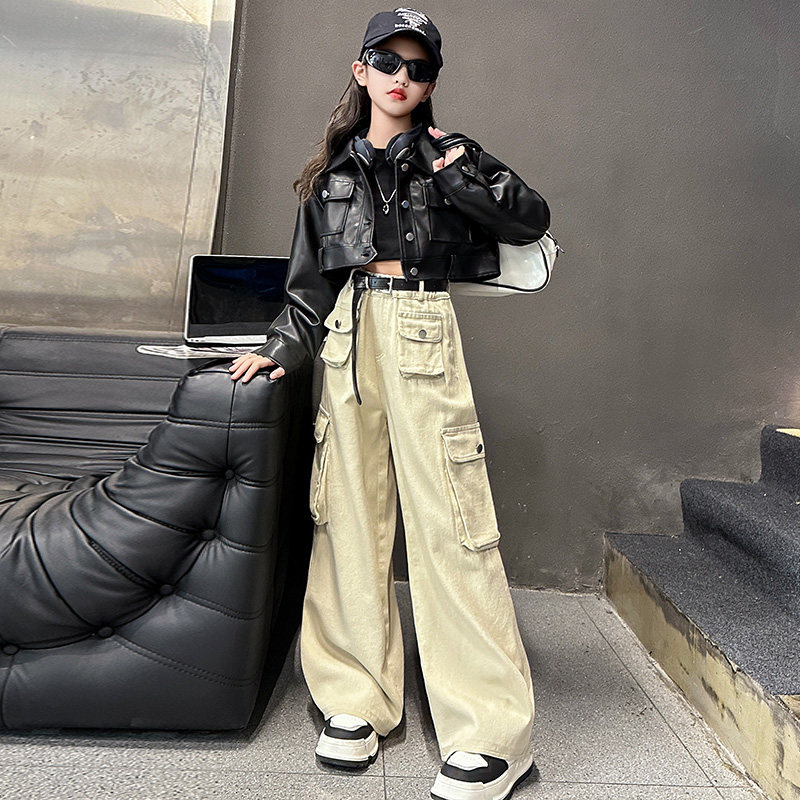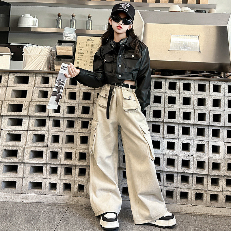 女童酷飒拽姐痞帅风穿搭套装2026秋季新款女孩短款皮衣儿童工装裤