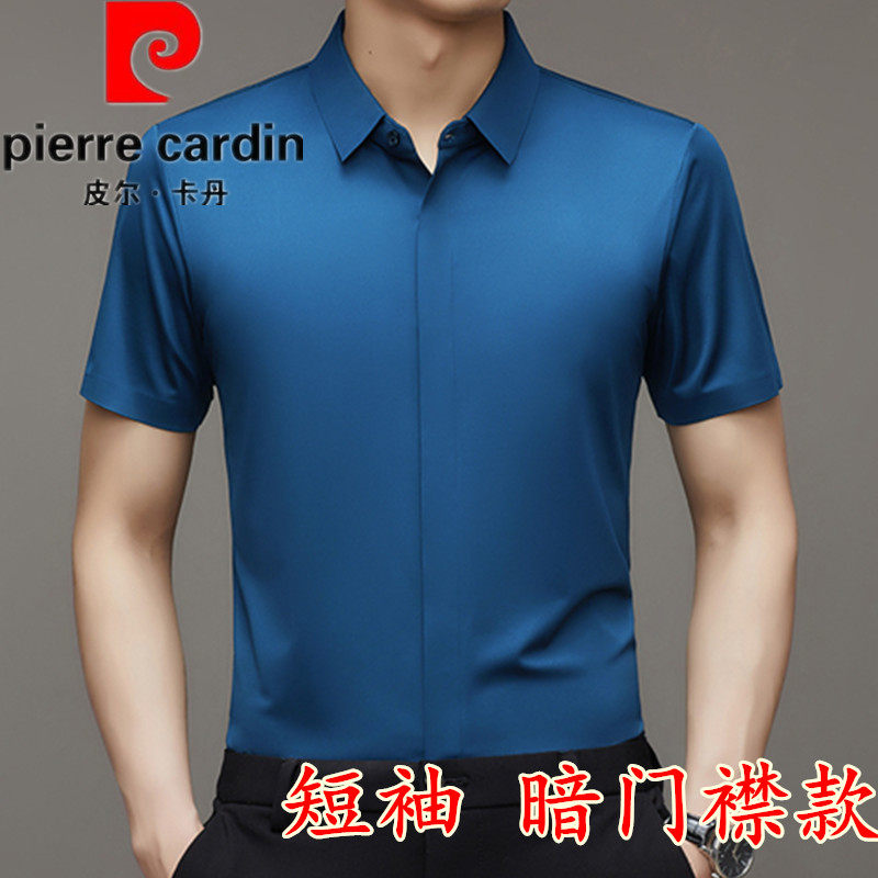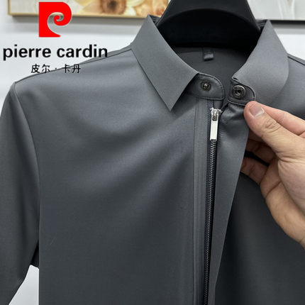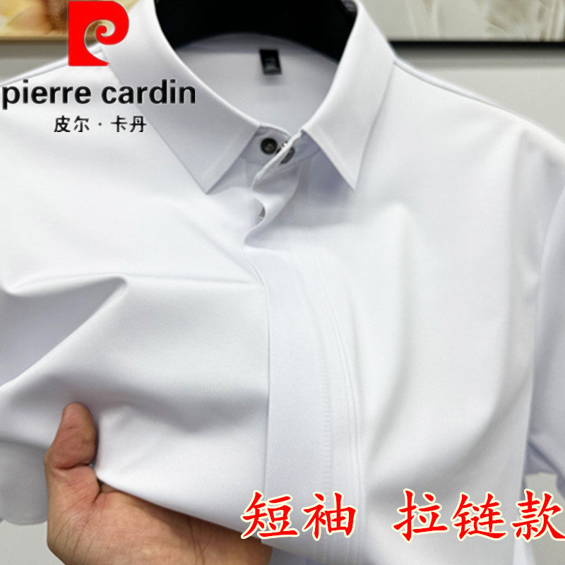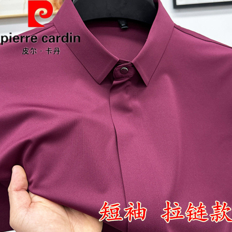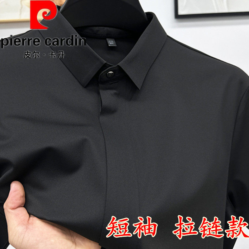 皮尔卡丹短袖拉链款衬衫男士休闲商务纯色衬衣爸爸夏季上装暗门襟