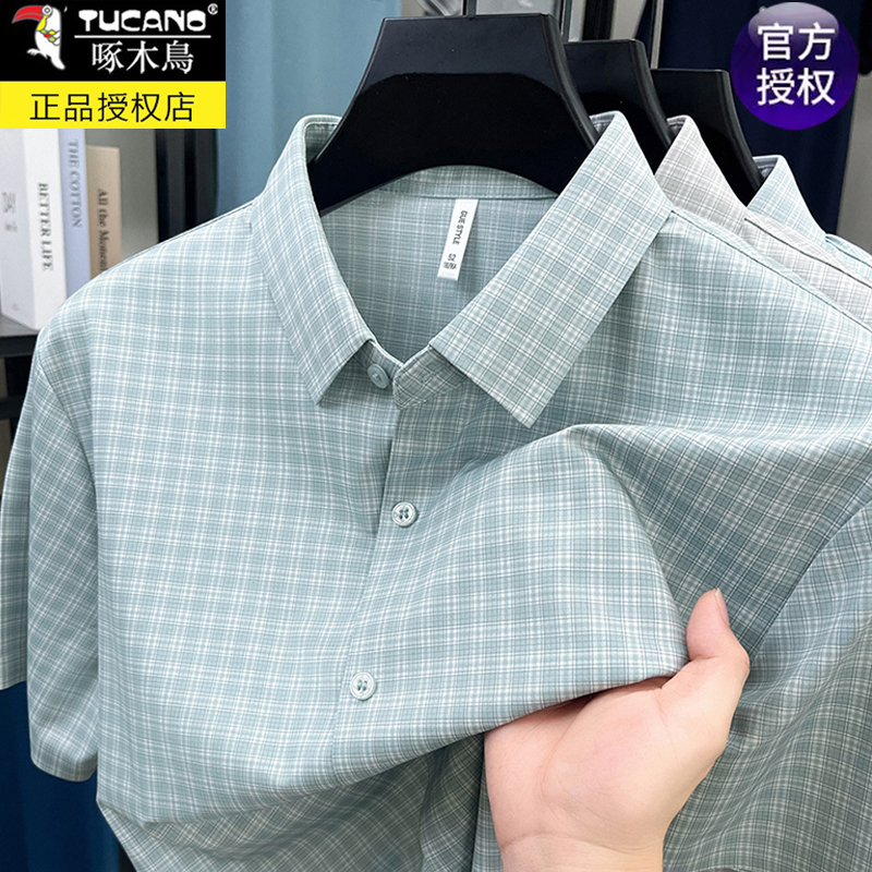 啄木鸟男士桑蚕丝短袖衬衫夏季中年无痕格子寸衫翻领免烫薄款衬衣
