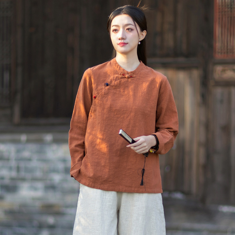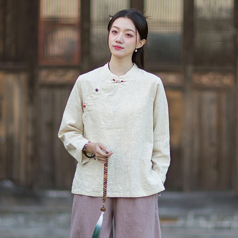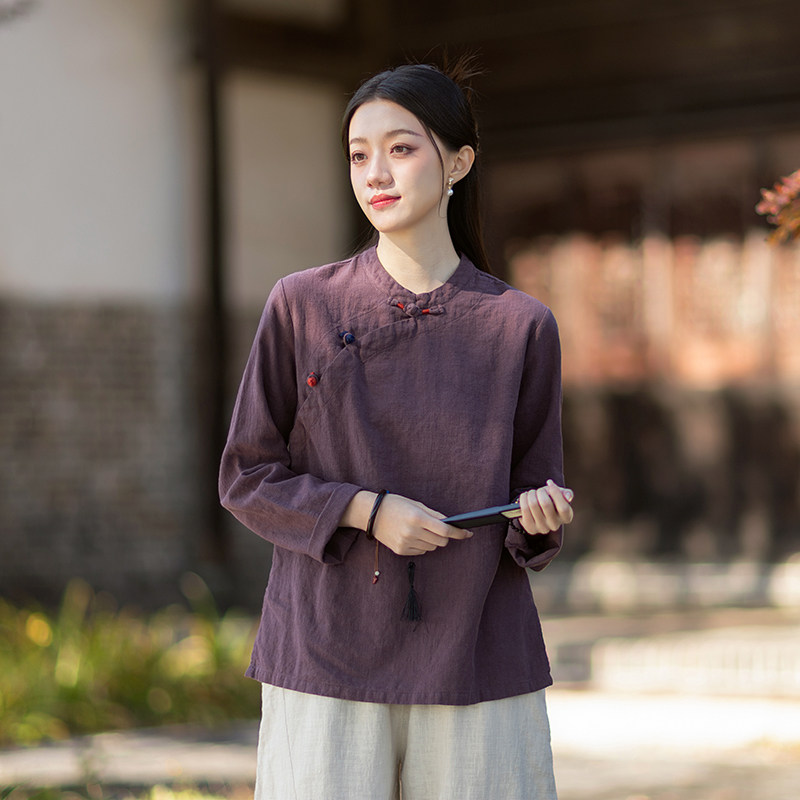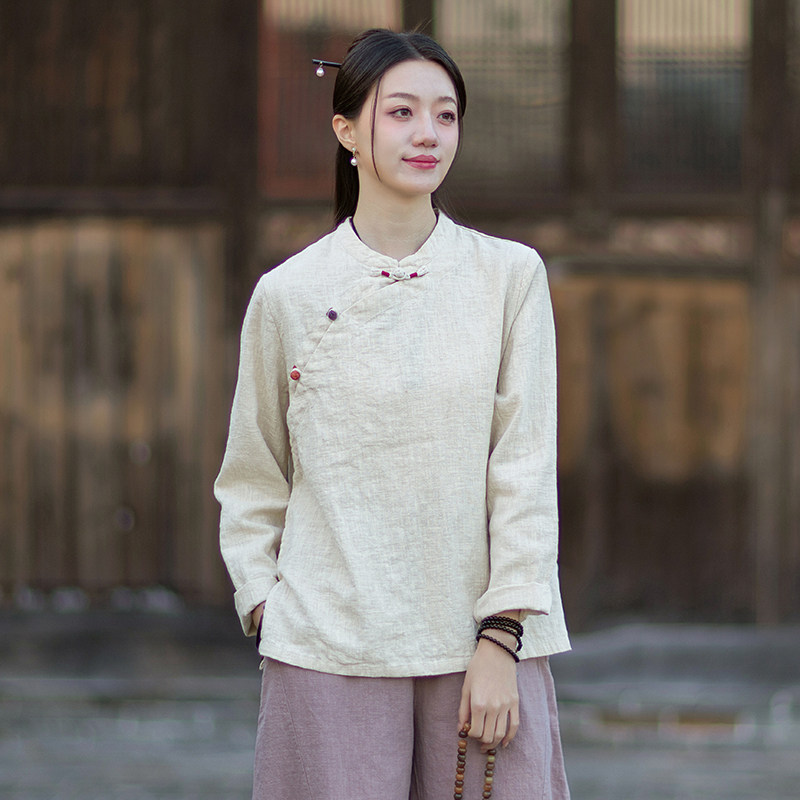 新中式棉麻衬衫女原创禅意茶服复古盘扣斜襟长袖宽松文艺茶服上衣