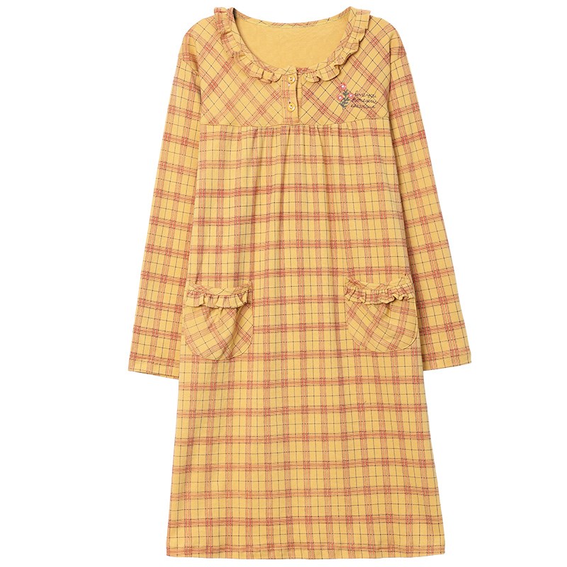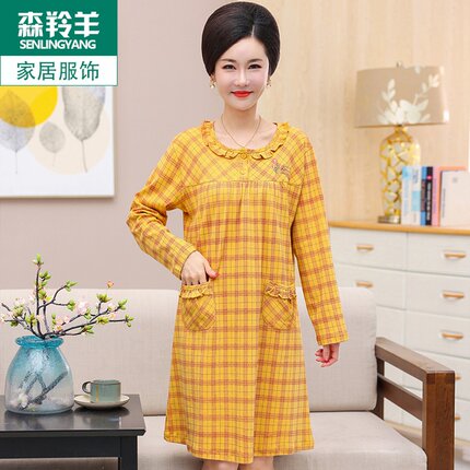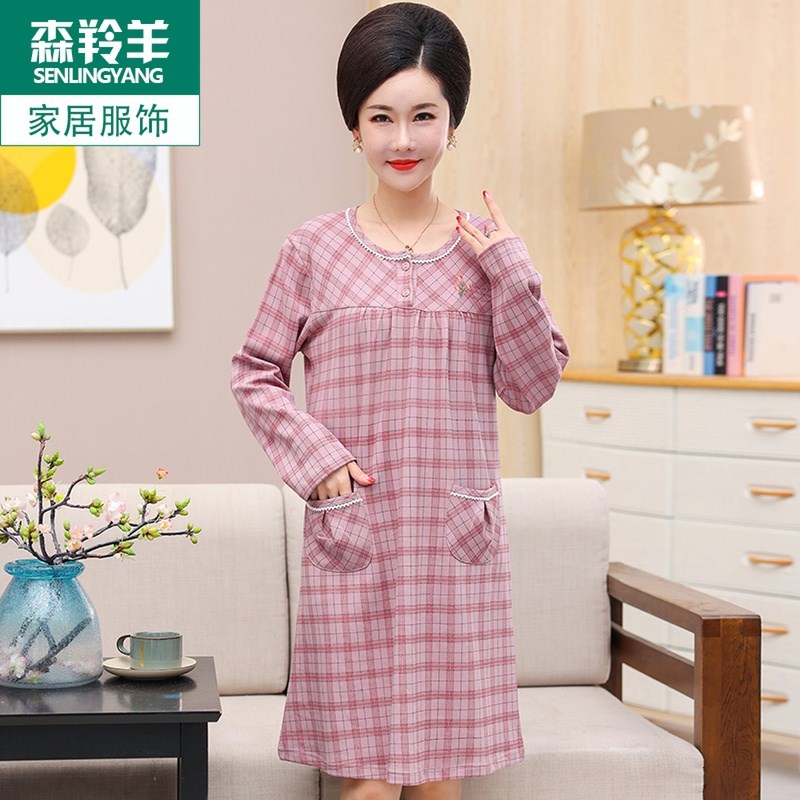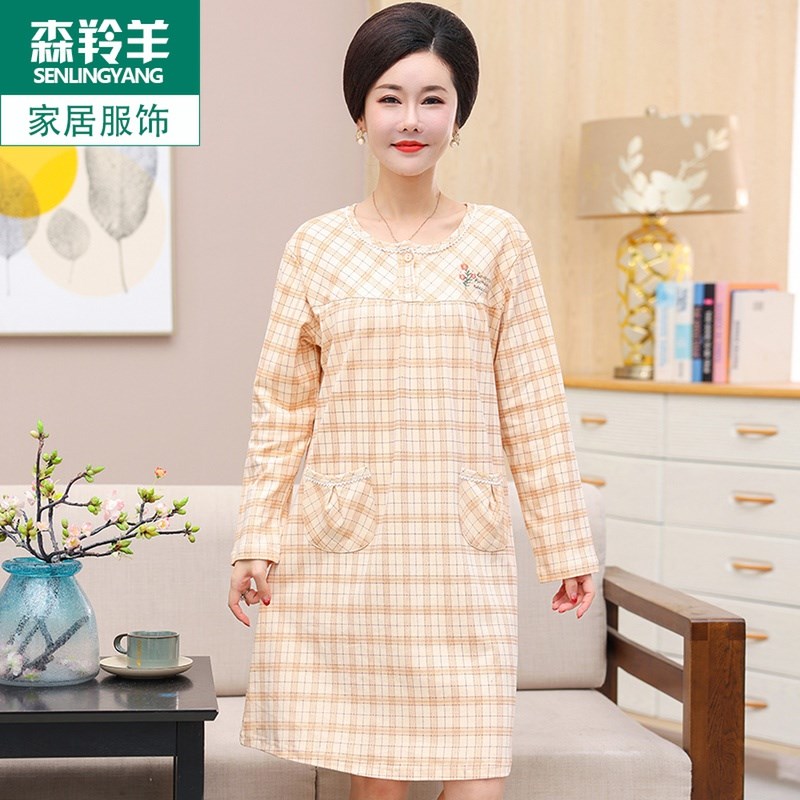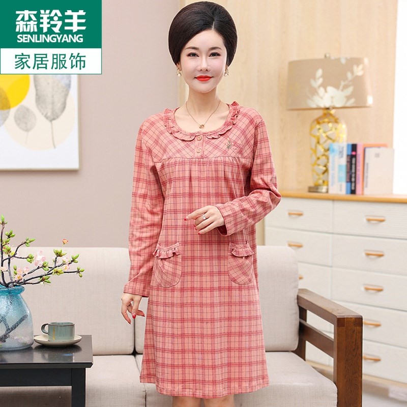 睡裙女春秋妈妈纯棉长袖休闲大码C睡衣裙子中长款睡衣女家居服裙