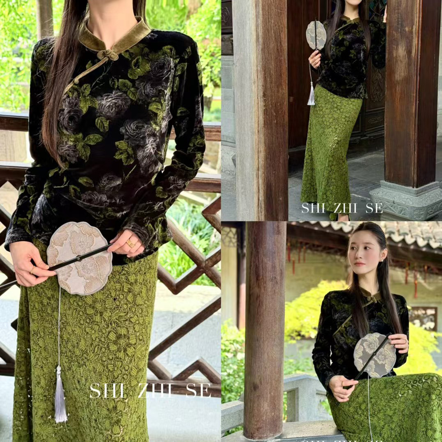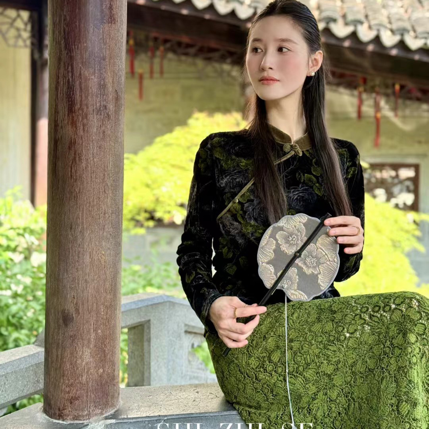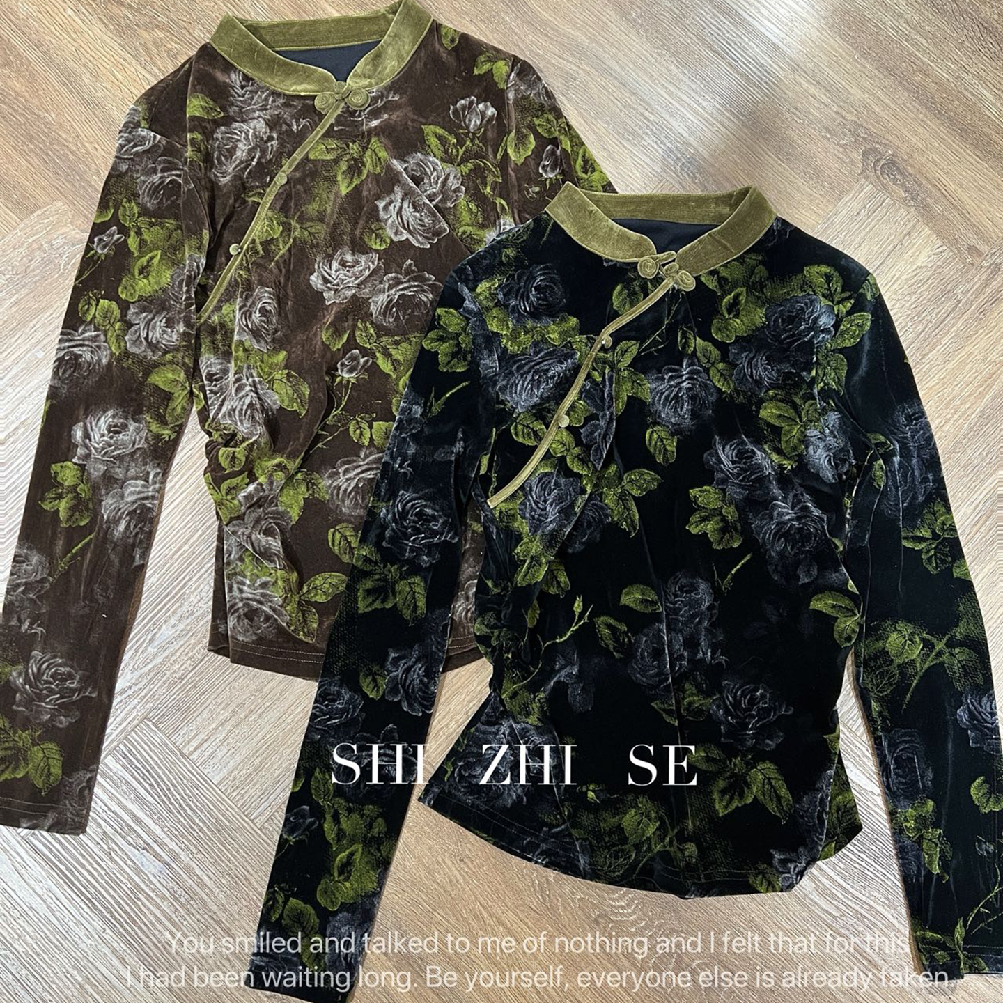 欧洲站秋装新款立领斜襟盘扣网纱植绒印花长袖衬衫上衣打底衫女潮