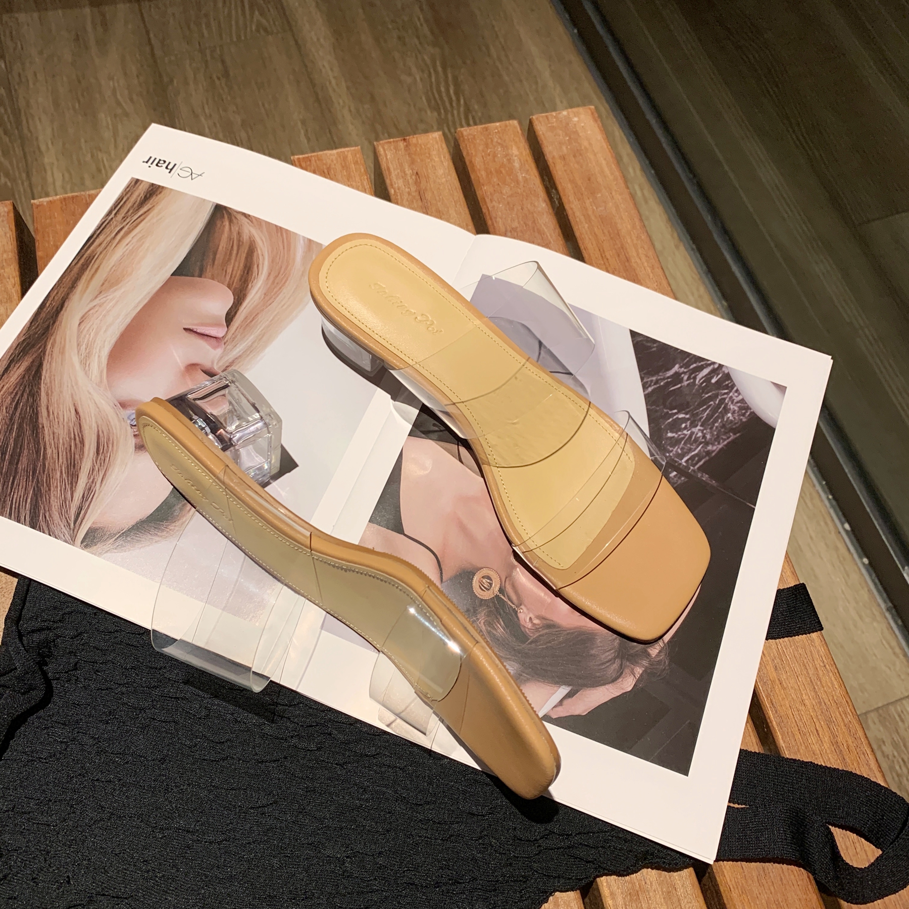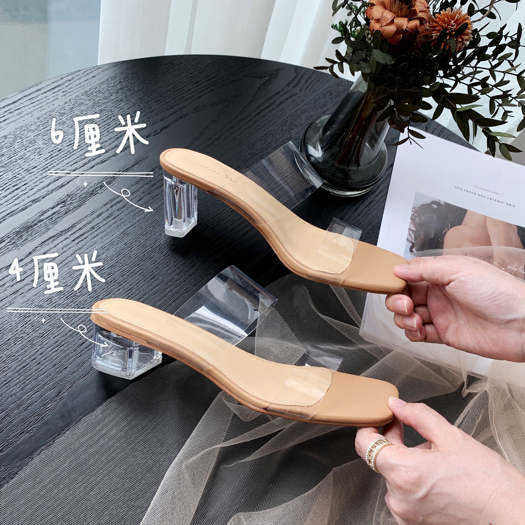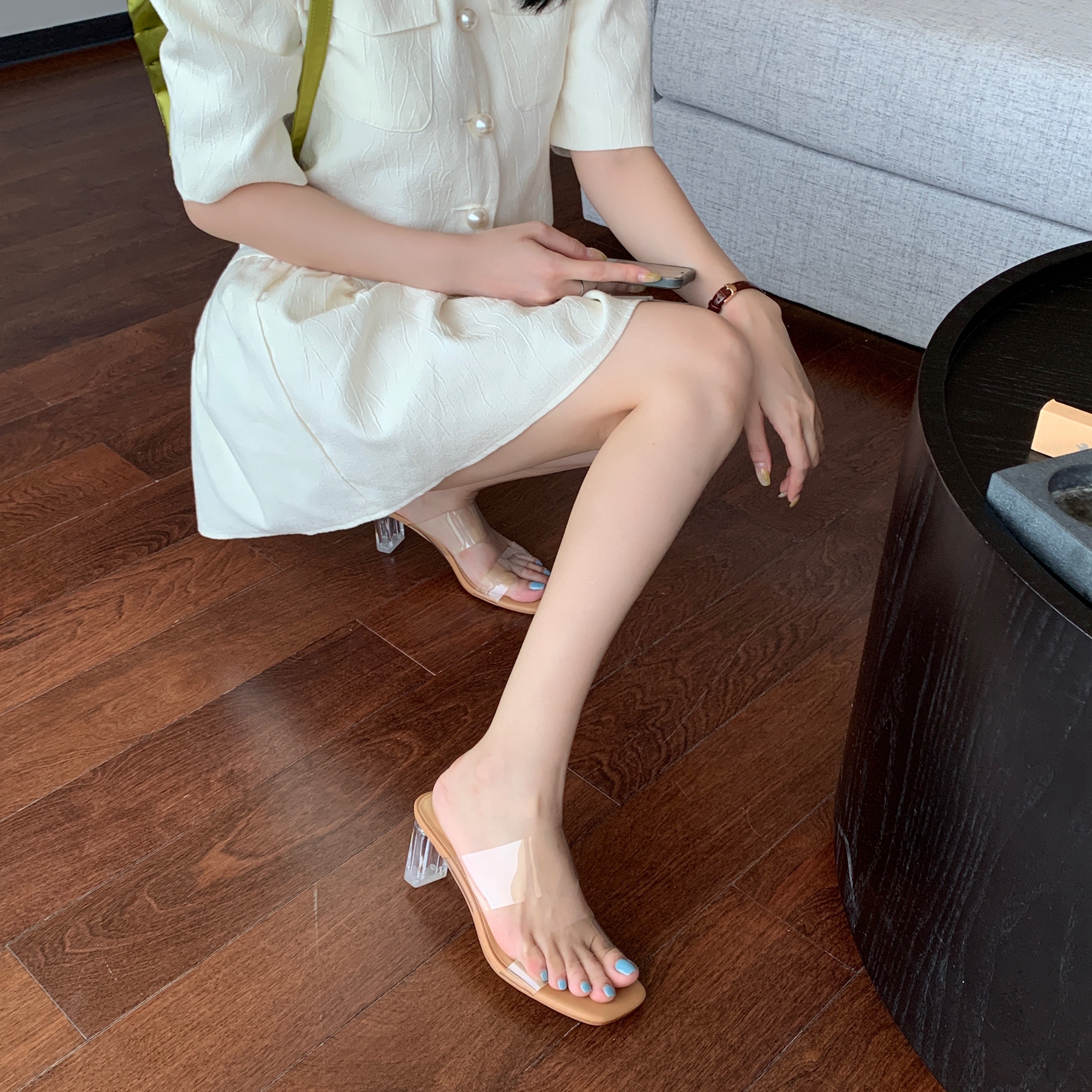 InkingPot彭姐 夏季仙女风羊皮拖鞋透明一字带水晶跟中跟凉鞋外穿
